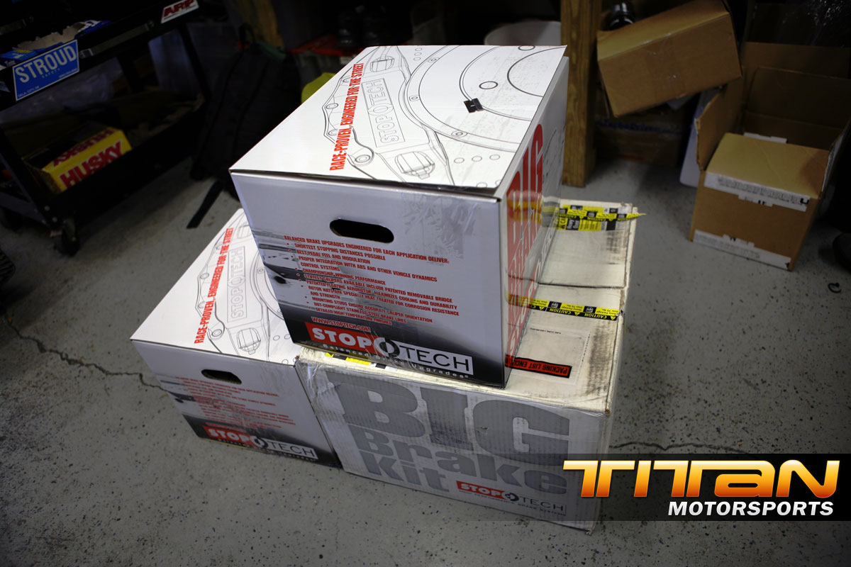 While we were at PRI, our Stoptech Big Brake kit arrived for Project