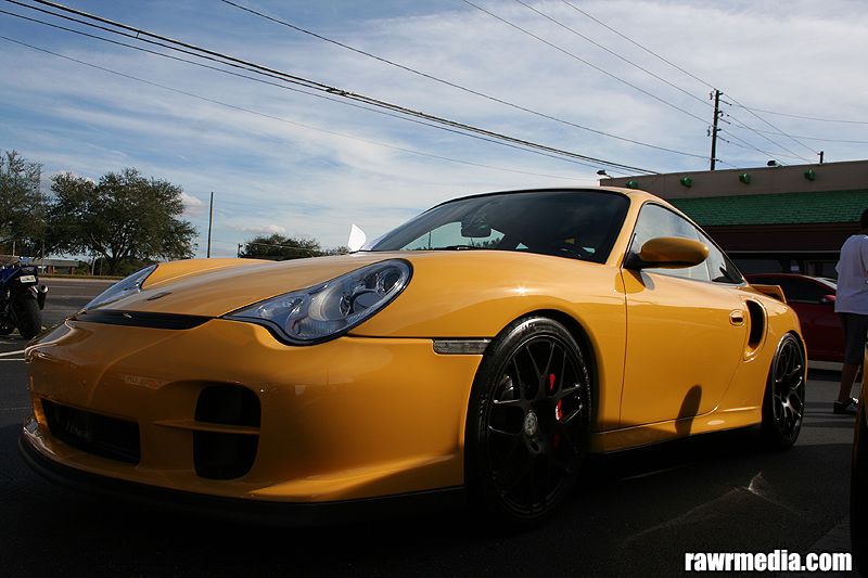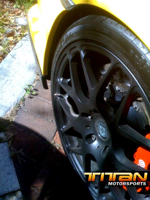 This weekend I had a curious passenger in my yellow Porsche. After having a nice brunch at Dexters in Winter Park with my Fiancé, sister and the bosses, we walked outside to the cars and I caught a glimpse of something on my wheel. After a closer I realized it was a nice 3-4 foot black snake hanging out around my nice Brembo Brakes and HRE P40 wheel. We tried to scare him off with a stick, but he kept moving around the wheel. I figured the best way to get him off would be a spirited drive, so we headed off to Lolicup for the 370z Tour stop and headed inside for some Bobba Tea.