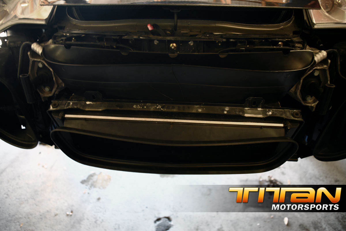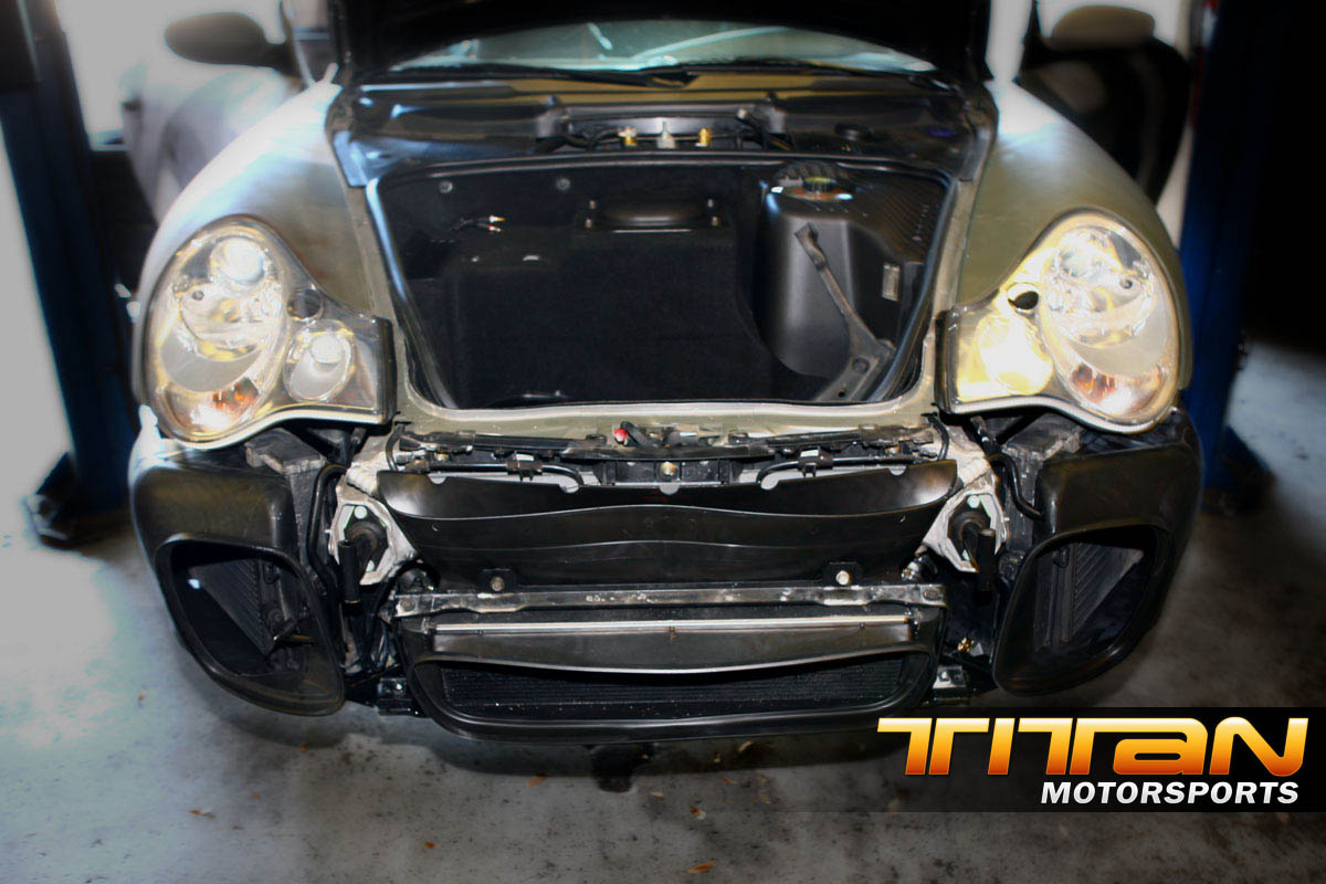 The biggest problem with this conversion lies with the center radiator. The GT2 features a tilted center radiator allowing the airflow to enter in the center and evacuate up through the grille which is added in front of the hood. It sounds straight forward, however do to the difference in cooling systems between the GT2 and 996 there is some custom modifications require. Be prepared to spill coolant all over the floor and yourself, but it’s all part of the gain (it’s a good idea to drain the coolant system as much as possible prior but you’re still going to spill quite a bit with the removal of the radiator).