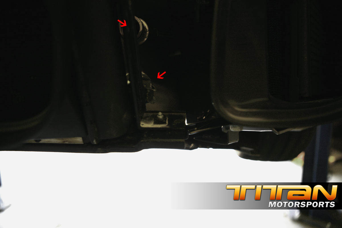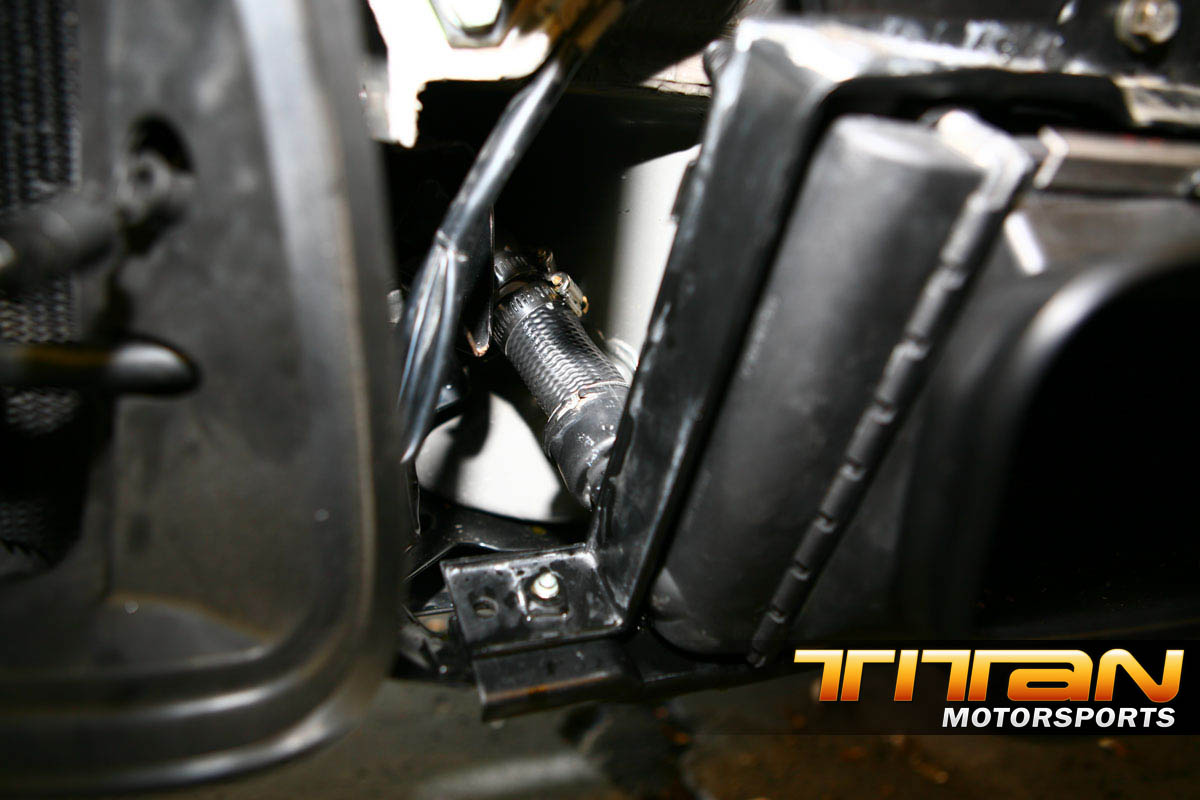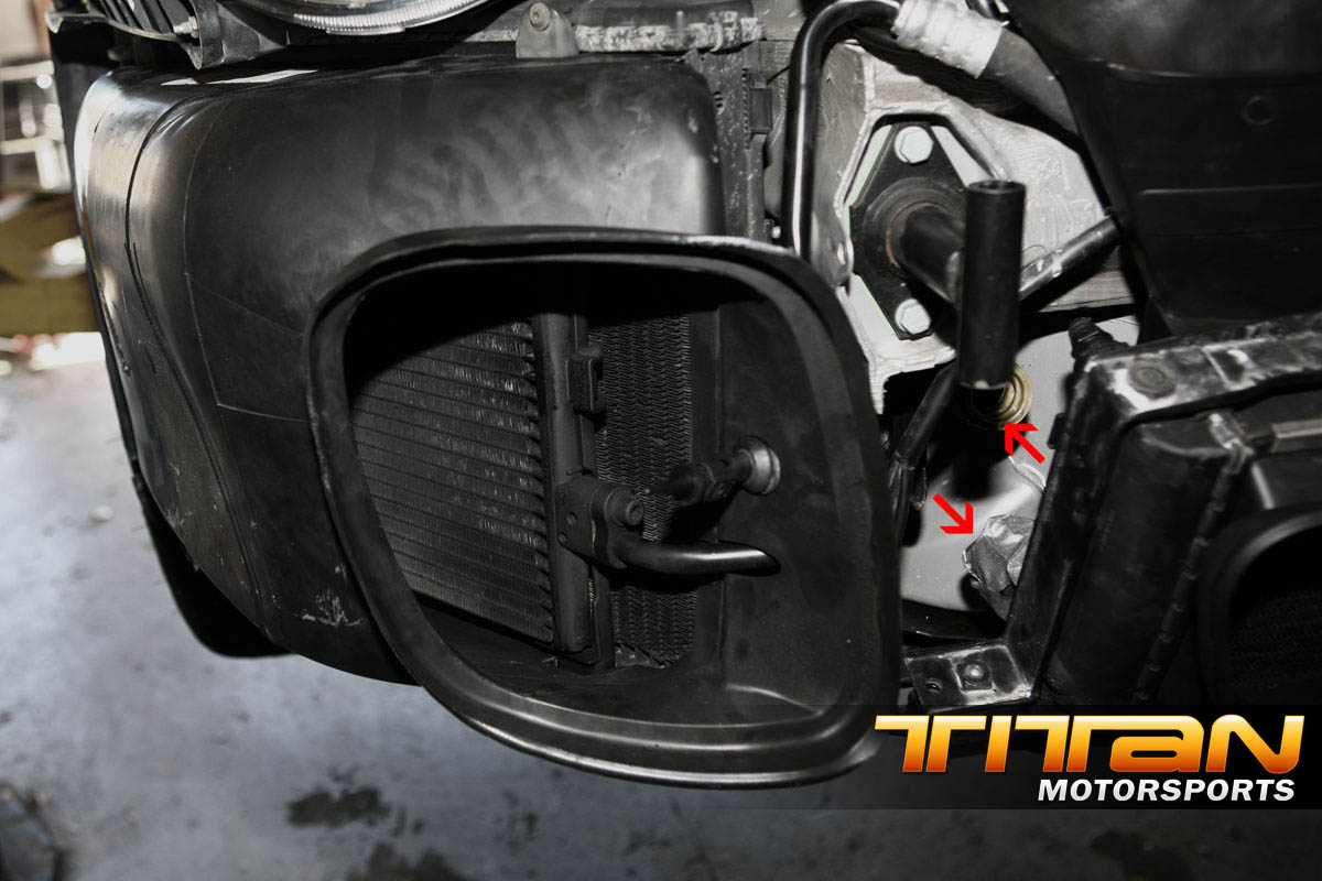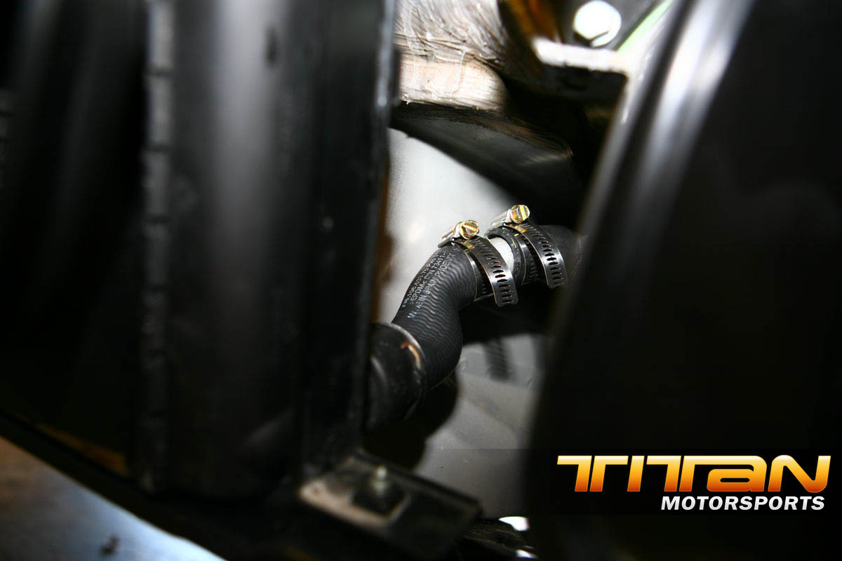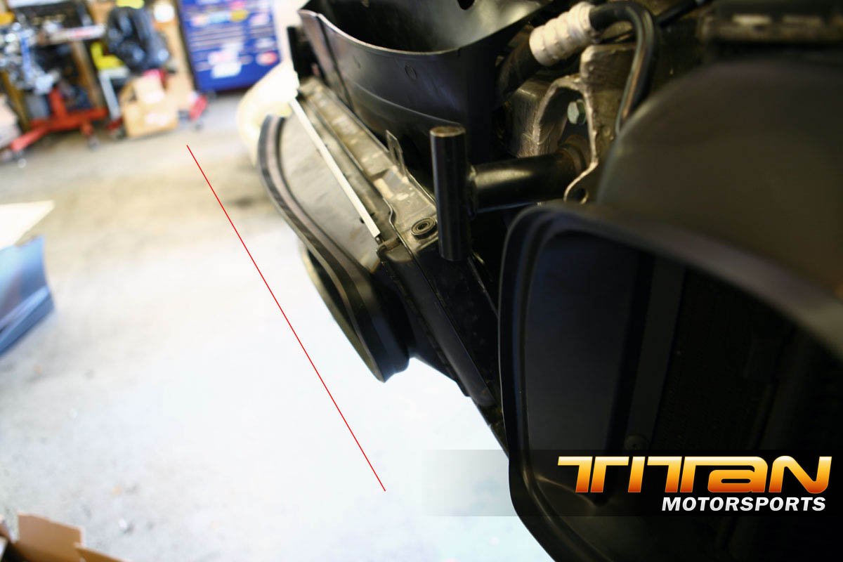 There will be 2 metal spacers needed behind the shroud to properly space the mounting brackets out, this will space the 996tt upper and lower surround brackets out enough to make them work with a bit of tweaking). Using M8x16x80mm bolts (check Ace hardware for these cheap) attach the upper radiator bracket through the frame, through the spacer (which is inserted inside the interior shroud) and into the mounting point on the car). This should line up the radiator just as you need but will leave quite a gap between your hoses and the radiator
