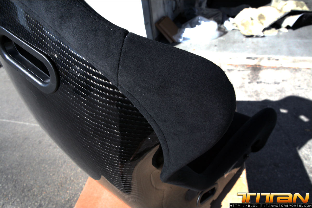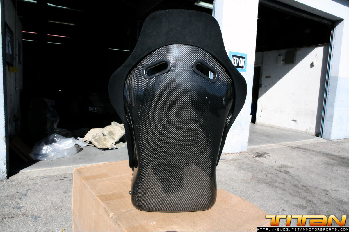 Today I felt like a kid waiting for Christmas as the UPS man arrived for our daily drop off. Our new Status Racing Ring GT seats arrived for our Porsche, and I must admit I was highly impressed with them. We opted for the Ring GT seat in a black carbon fiber with black alcantara covering for this application to tie in with the black carbon interior package in our car. The attention to detail on these seats is unbelievable, the weave is perfect, the covering has no wrinkles, and they even include a billet etched serial plate on the seats. These seats are available in a FRP, Carbon, or Carbon Kevlar finish and have covering options available in cloth,suede, and leather in a wide variety of colors. Most seats can be turned around in 2 weeks of less, a very impressive feat given the high standards of quality Status strives to achieve. Like many of their products, these seats meat FIA safety requirements and are acceptable in most racing organizations.