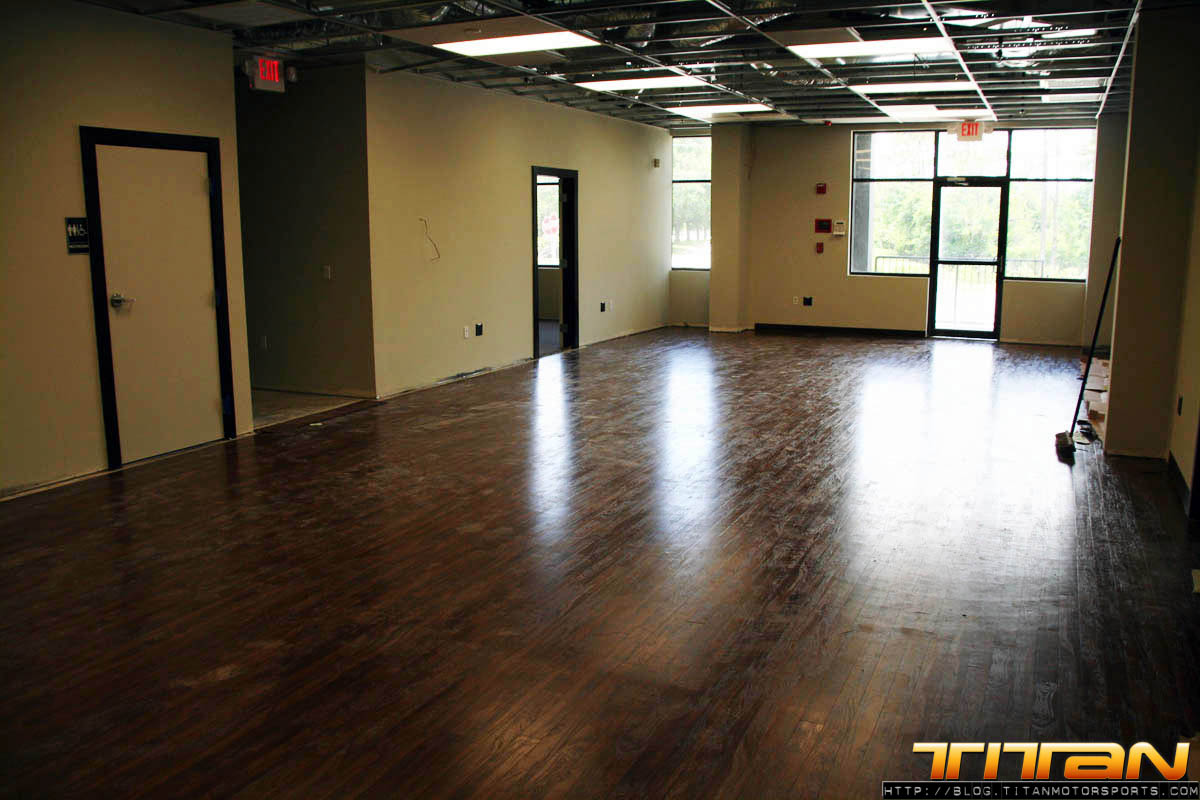 The wood flooring was installed in the showroom, we opted for a dark wood to contrast with the walls and match the stainless and black fixtures that will decorate the walls.