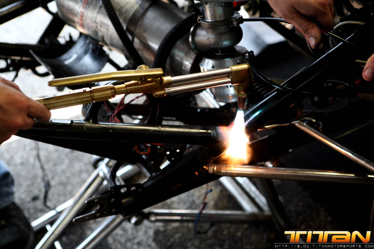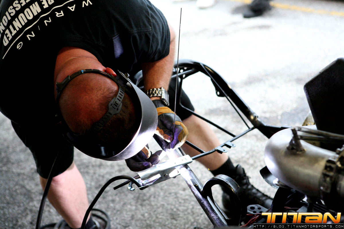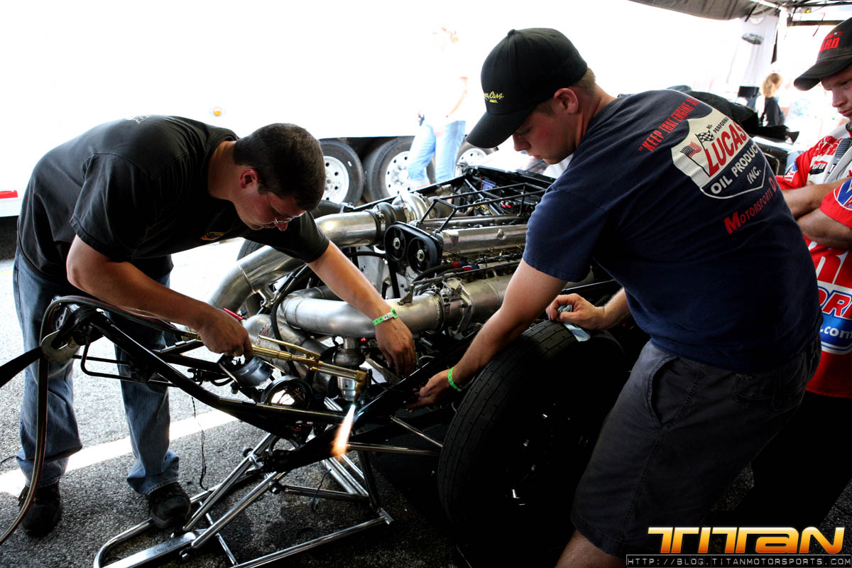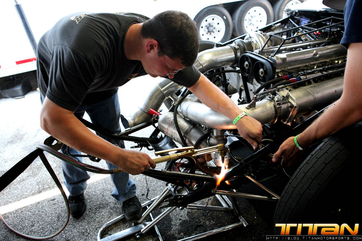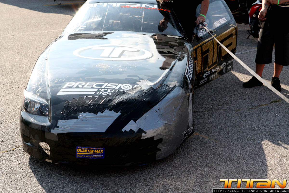 Well, now the team is back to square one: banged up car, race on the line. Most teams would have probably called it a day at that point, but not Team Titan. Team Titan with Rick Jones, Rickie Jones, Joe Brown of RJ Race Cars, equipment from Tim McKamis and welding support from Kelly Campbell allowed the re-construction to begin. We had to duct tape the entire front nose of the car, as it was totally mangled. We also used fiberglass and resign to help strengthen it. The fuel cell bar was also bent way out of shape. We tried to straighten the fuel cell bar with a tow strap, but the first 3 attempts didn’t work and about pulled the car off the pro jacks. So we had to drop the car on the ground, Gary got in and held the brakes, we held the car back and brought our Mule (tow vehicle) and used it to be weight/leverage to straighten it. The mule started moving, so we had to hold its brakes. Slowly the bar started to straighten. We needed to move it like 6″ and it moved 1-1/2” so that was about 1hr in and we weren’t getting very far. We went and Robert Patrick had an acetylene torch and we had to cut all the wiring out of the way, remove any fuel that were around and heat up the bar. We also had to remove the fire bottle because the bracket that held it was bent, so when we pulled that out we didn’t pin it and it went off in the pits. It was an interesting situation to say the least. So we had to grab our spare and off we went trying to get it fitted back onto the car. Finally we re-wired the car, checked it out, checked nose fitment (a few zesus’s were busted) and got it working. We then did our standard turn around procedure and found one of the rear Mickey Thompson 10.5’s were cut from the accident. So our 2nd set went on the car. We then checked all the electronics and fired it up, and made sure the car ran good. The car looked like hell, but she was ready to roll.