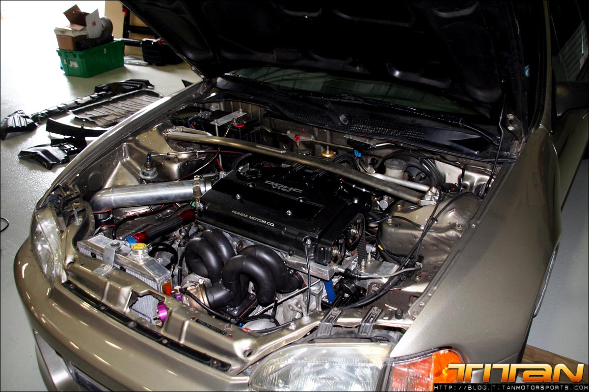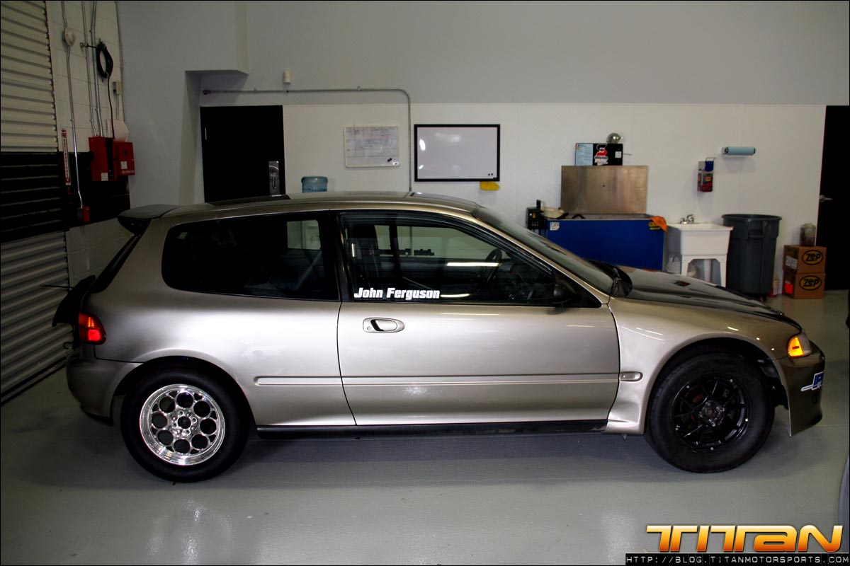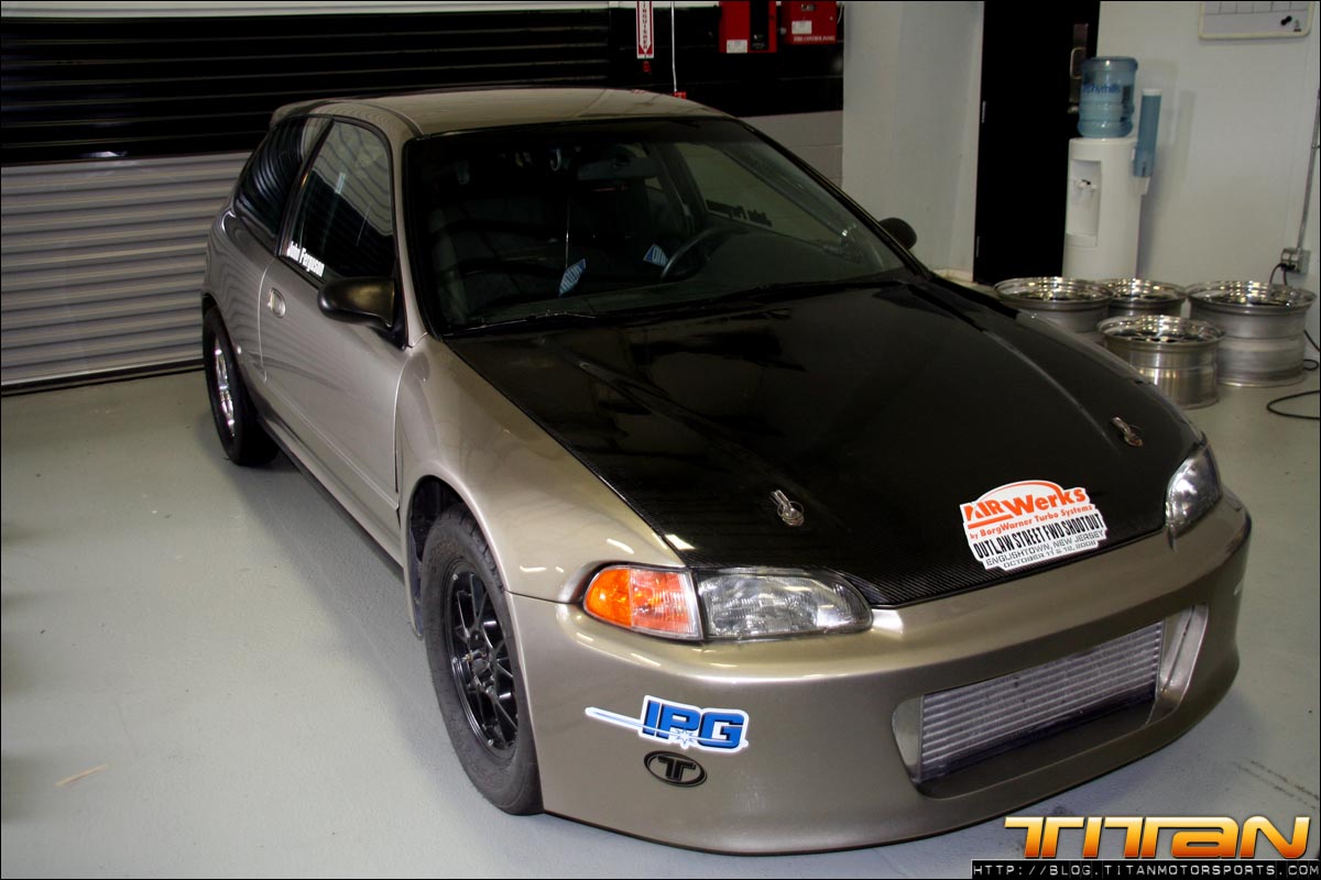 After recent testing at Orlando Speedway, the engine had a little unexpected wear, and was torn down and rebuilt here at Titan, in preparation for this weekend’s race. In addition to some super-secret engine and turbo modifications, the civic also got a fresh face lift, with a new front bumper to match the flared fenders. The car now not only looks meaner, but sounds it too, and is ready to give the guys in the Outlaw FWD class a run for their money.
