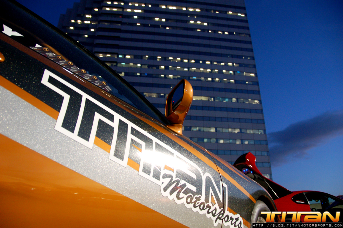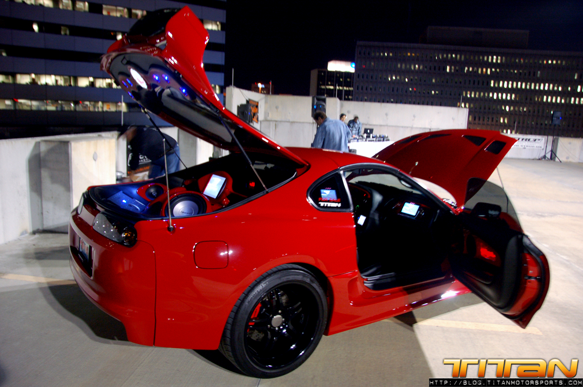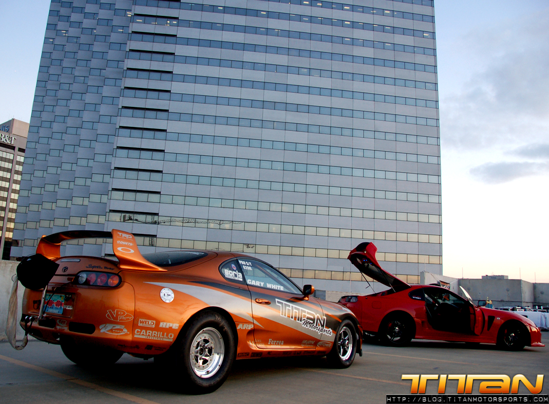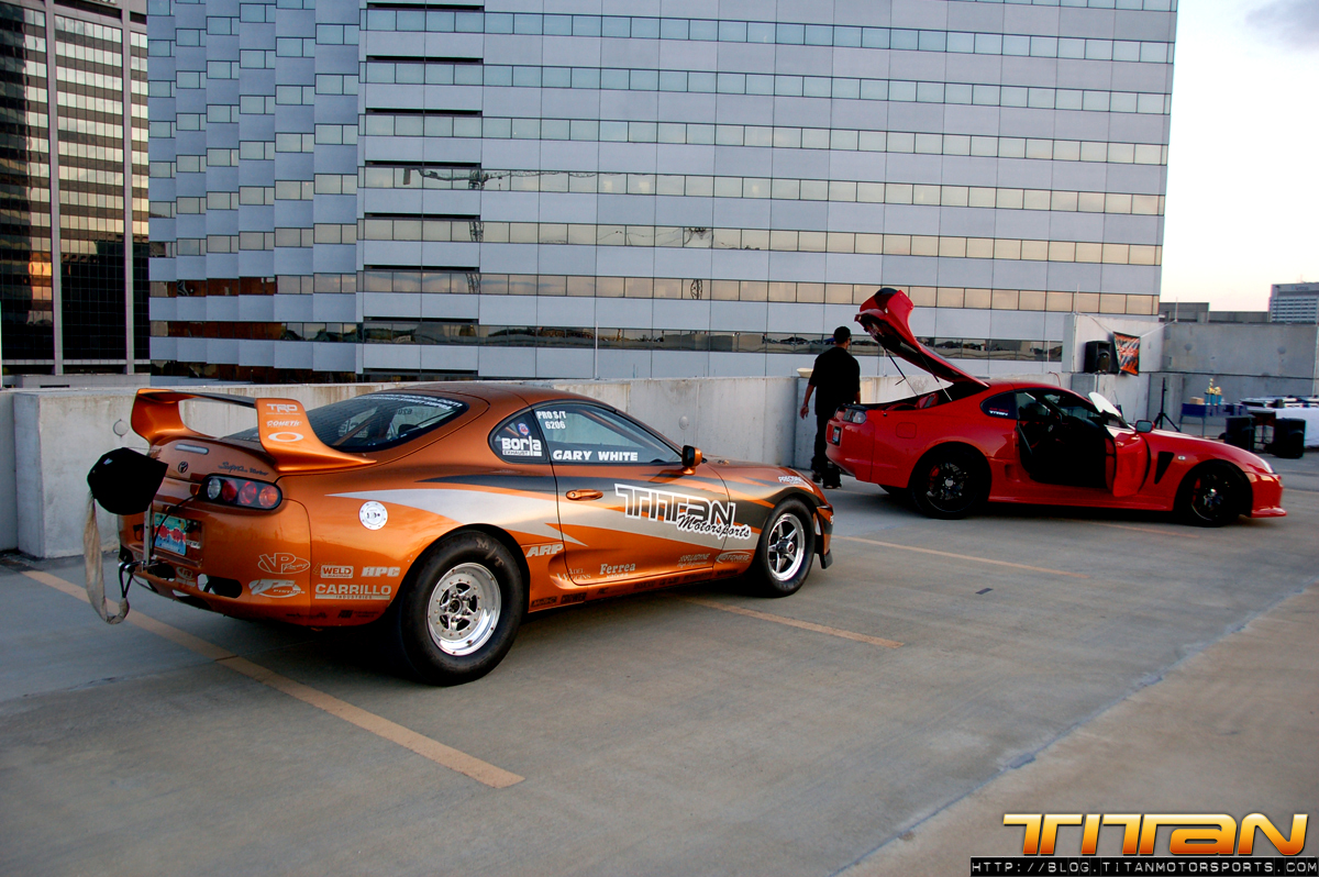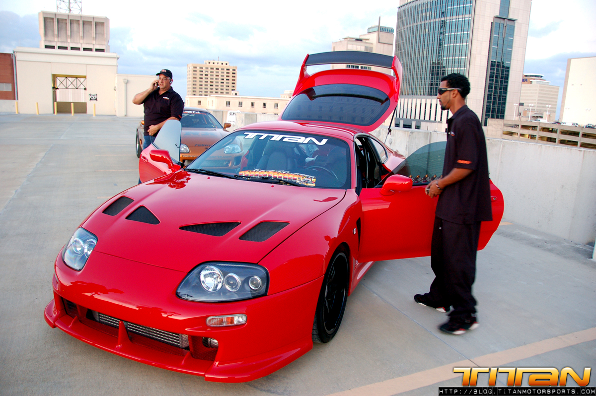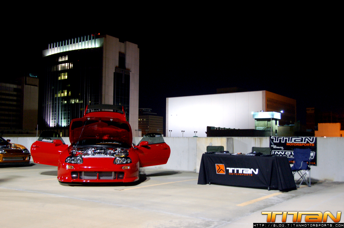 This weekend Titan was invited to attend the 5th Sibling Rivalry (SR5) show in Jacksonville, FL. What started out as a car show at a Toyota dealer is now a yearly event at a parking garage in the heart of downtown Jax. We decided to take two Supras to the event: Dr.Nicks “recovery room” TRD wide-body Supra that has been featured in both Modified magazine here in the US and Top Performance in the UAE, as well as our own copper Supra drag car. The crew of SR5 gave us a spot right in the heart of the action on the top floor of the parking garage. I have been to car shows in garages before, but never with a backdrop of a downtown skyline like we had for this event. The show got started just before dusk and went into the night. Not only did they have local DJs there, but there was a performance by the Jacksonville Jaguars Drum-Line as well and Dr. Sam Beckett. To top it all off Panda Express was at the event giving out free food. This was a great show with a really nice mix of cars, while it’s primarily Toyota, Lexus and Scion, there was a few other imports (Honda, Acura, Nissan and Volkswagen) and the style of cars was everything from VIP to all out race-cars. If you get the chance to attend a Sibling Rivalry event you should definitely check it out!