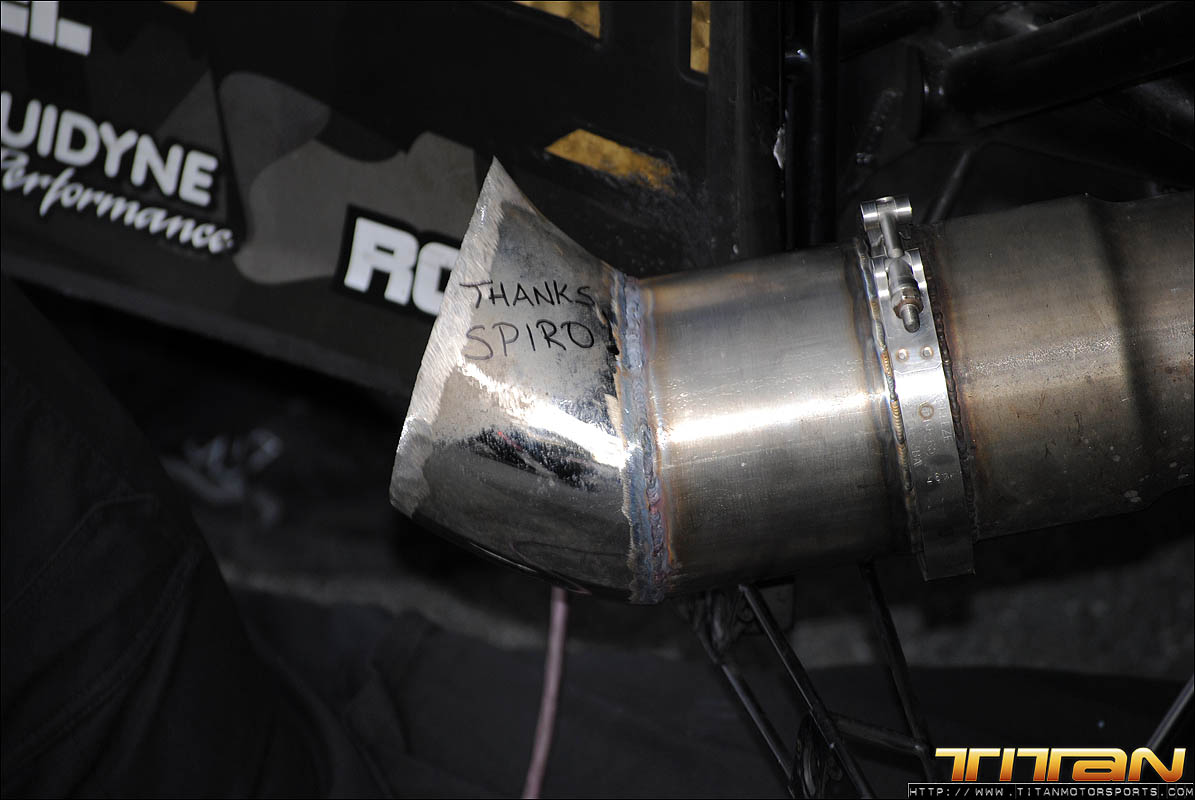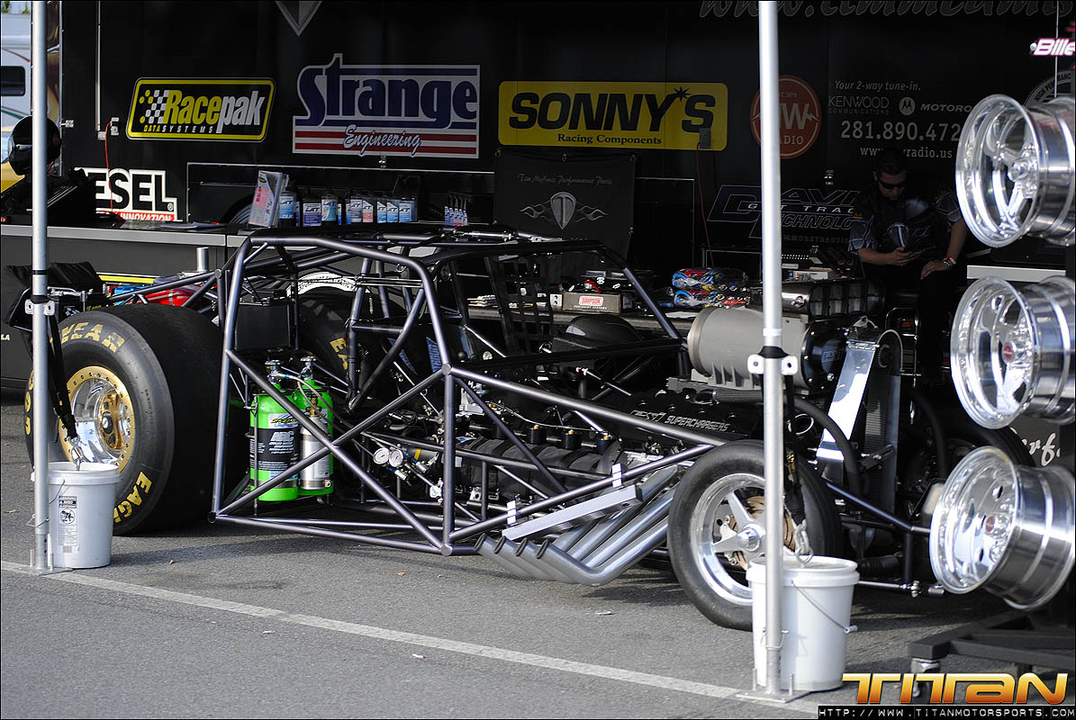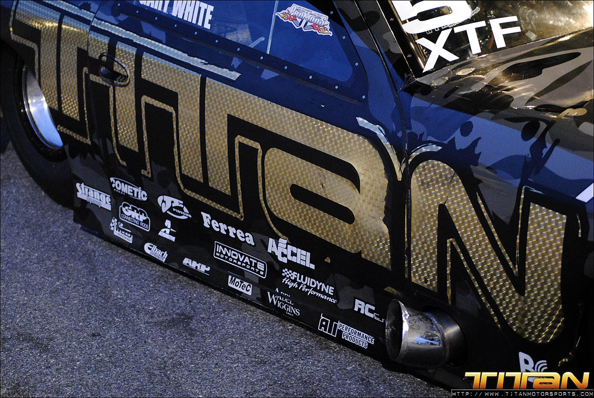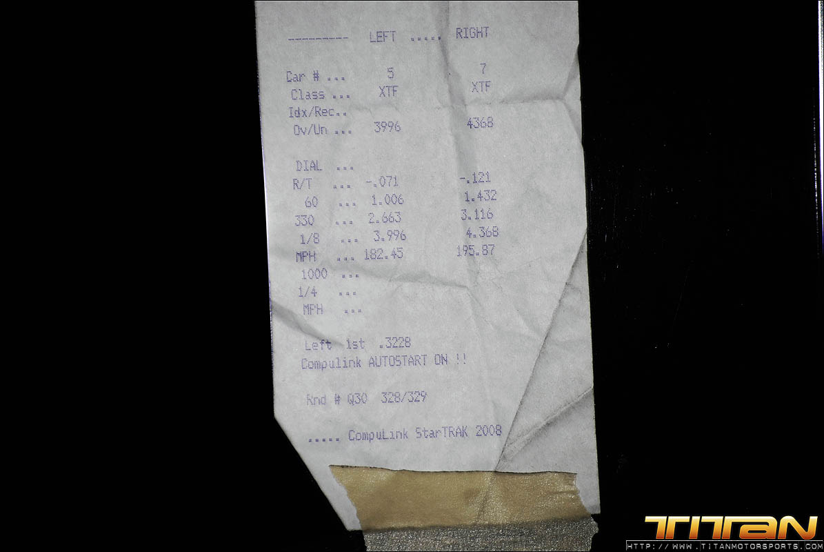 After testing the new tune-up on the air jacks in the pit, Brett and Eric were confident they had resolved the starting line issues that plagued the first 2 qualifying passes. The team gathered their gear and brought the car to the starting line for the final pass of the evening knowing they had made the necessary changes to get the car to go A to B and make the field. Gary being the seasoned professional he is, trusted his crew had resolved the previous rounds issues and staged the car with something to prove. As the car launched past the starting line it was apparent the car was on rails and ready to make a solid pass. As the scoreboard lit up with 3.996 at 182.45 mph, we realized exactly how solid this great pass way! After many long months of trying, Titan Motorsports had made its way into Mickey Thompson 3 Second Club and added another line in the history books. We solidified our position as the fastest import in the world, and the first ever to make a 3 second pass on 10.5 tires.