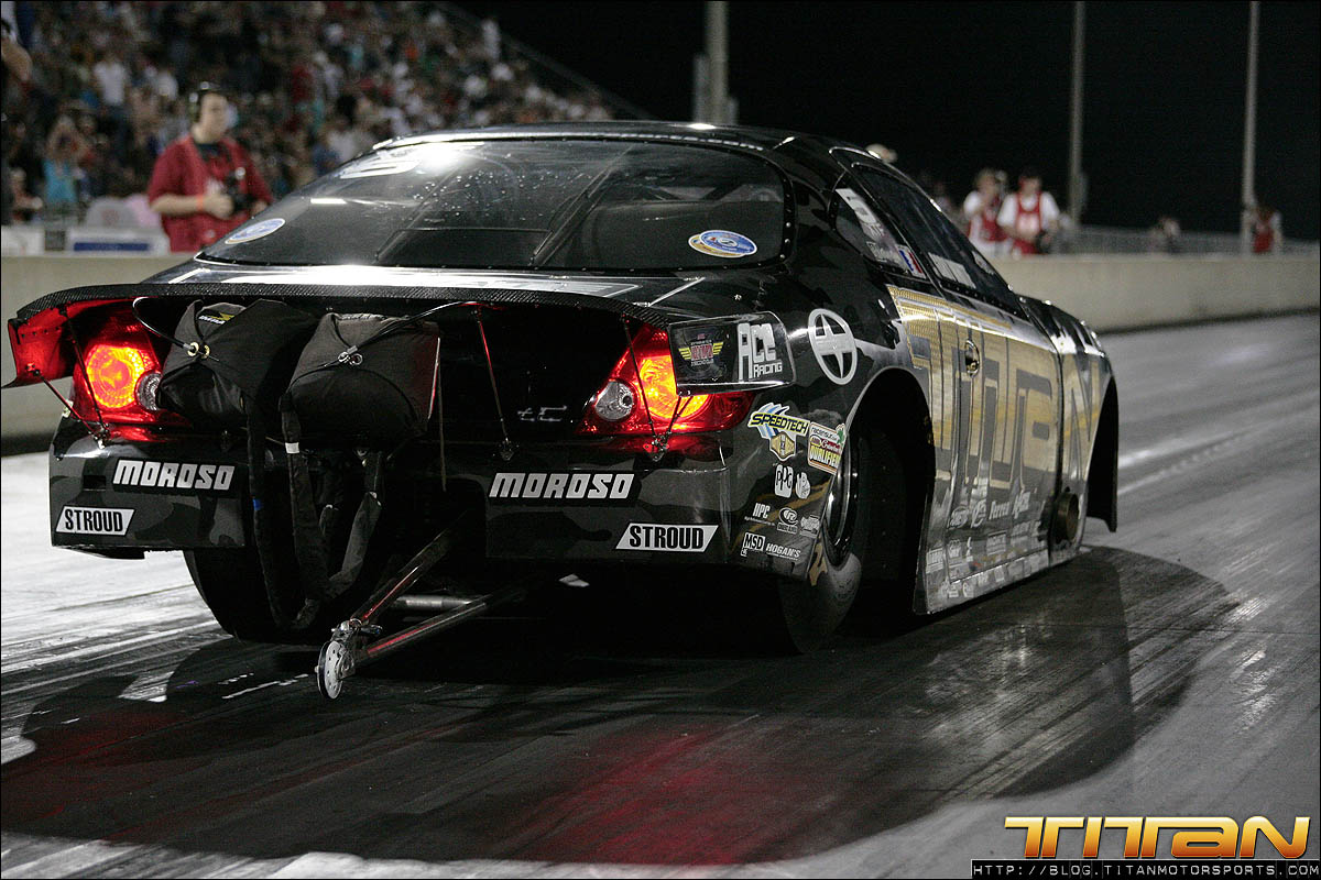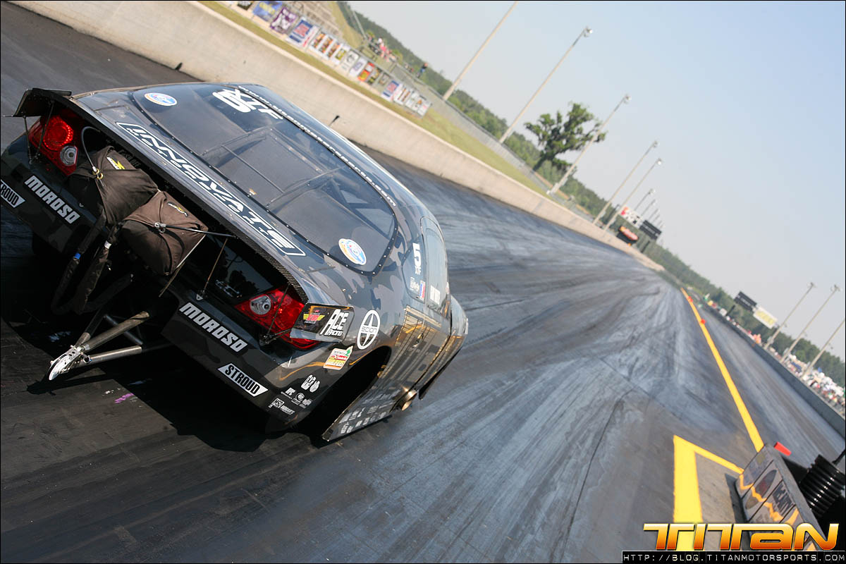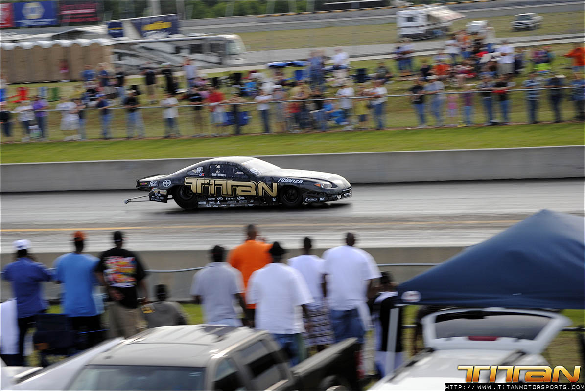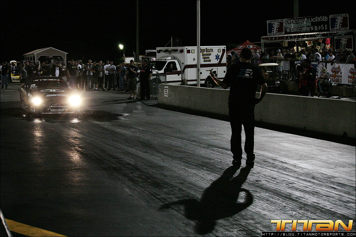 With a Toyota 2JZ 6 cylinder with only 186 cubic inches, many doubted we could be competitive against 800+ ci turbocharged, blown, and nitrous combinations. We set out to prove them wrong, and continue our quest for a 3 second pass. After solid test numbers at Alabama International Dragway last week, driver Gary White and Team Titan were excited to travel to Valdosta for the ADRL Georgia Drags with our Scion Tc. The weekend initially proved to be challenging, the Valdosta track was prepped better than anticipated and new challenges appeared. A mechanical issue appeared in the first qualifying session which caused us to abort the run shortly past the starting line. Crew chiefs Brett White and Eric Luzinski reviewed the data from the run and quickly diagnosed and corrected the gremlin. The second qualifying pass ended much like the first with the car leaving with limited power. Brett again reviewed the engine data and made drastic changes to the tune-up for the last qualifying pass of the night.