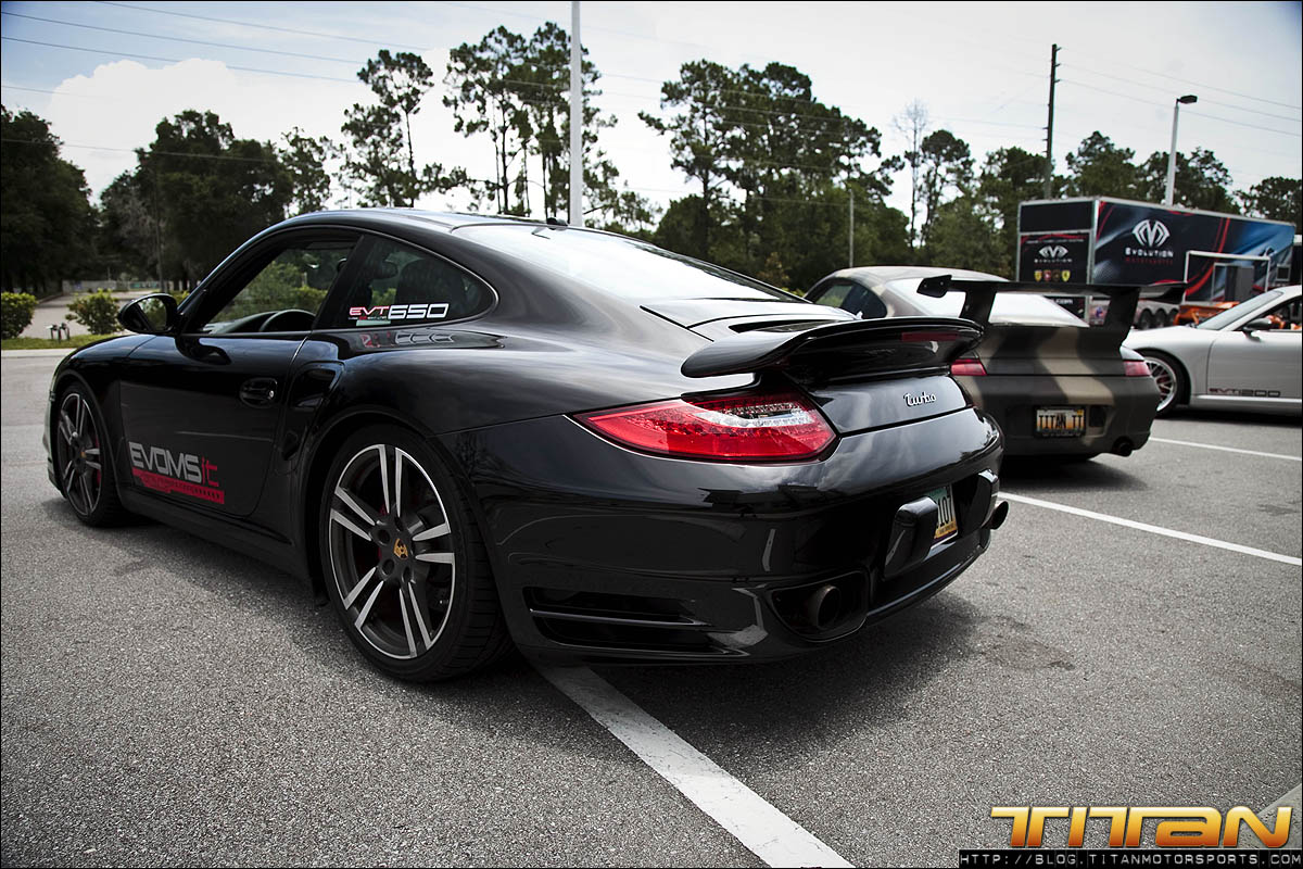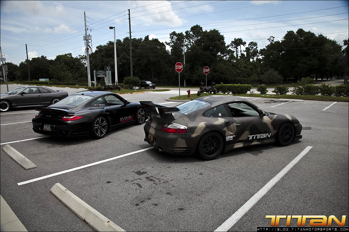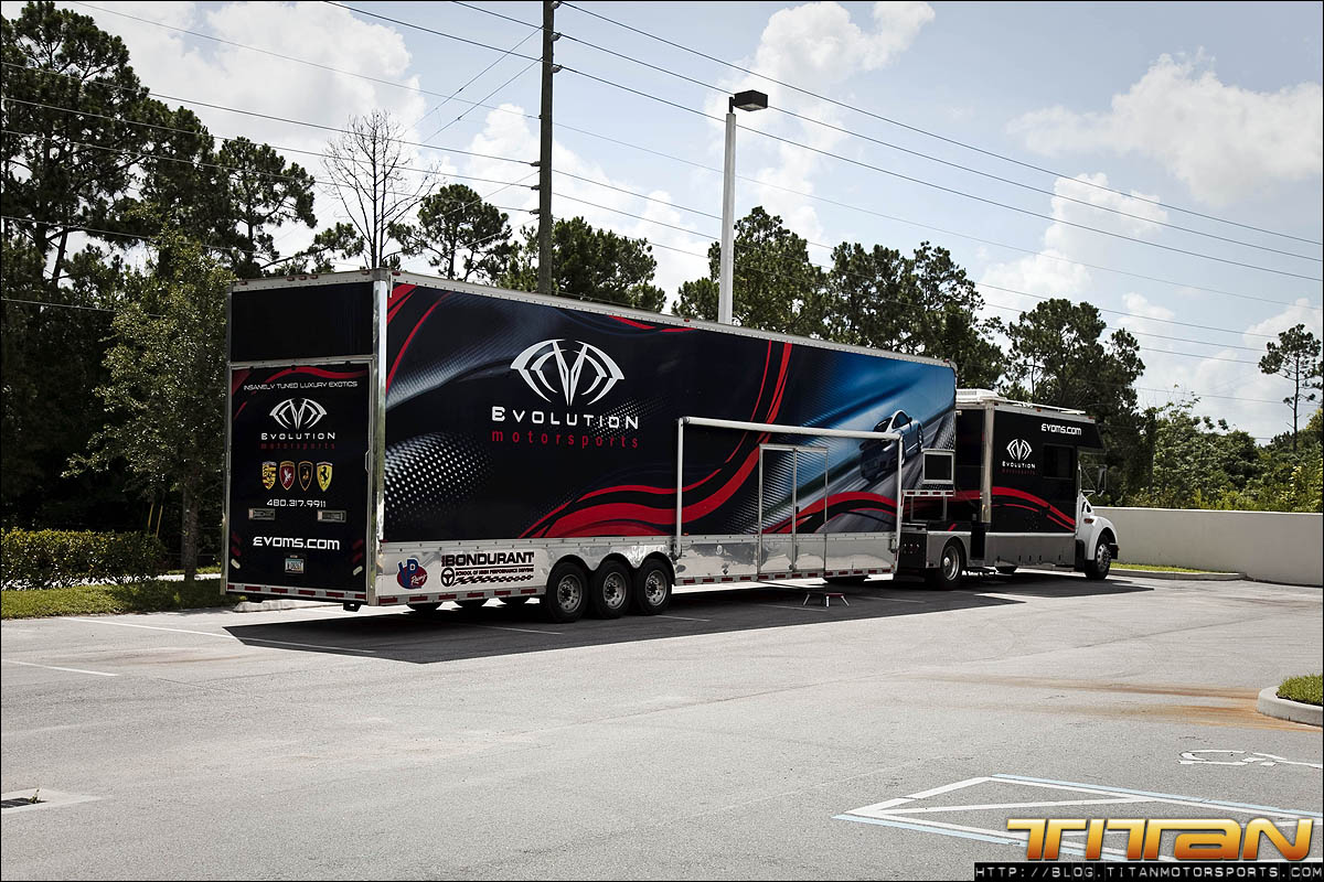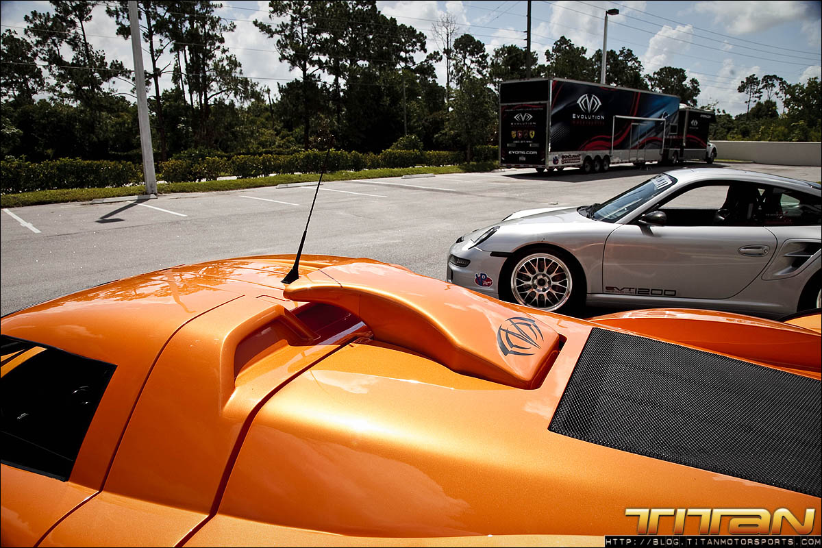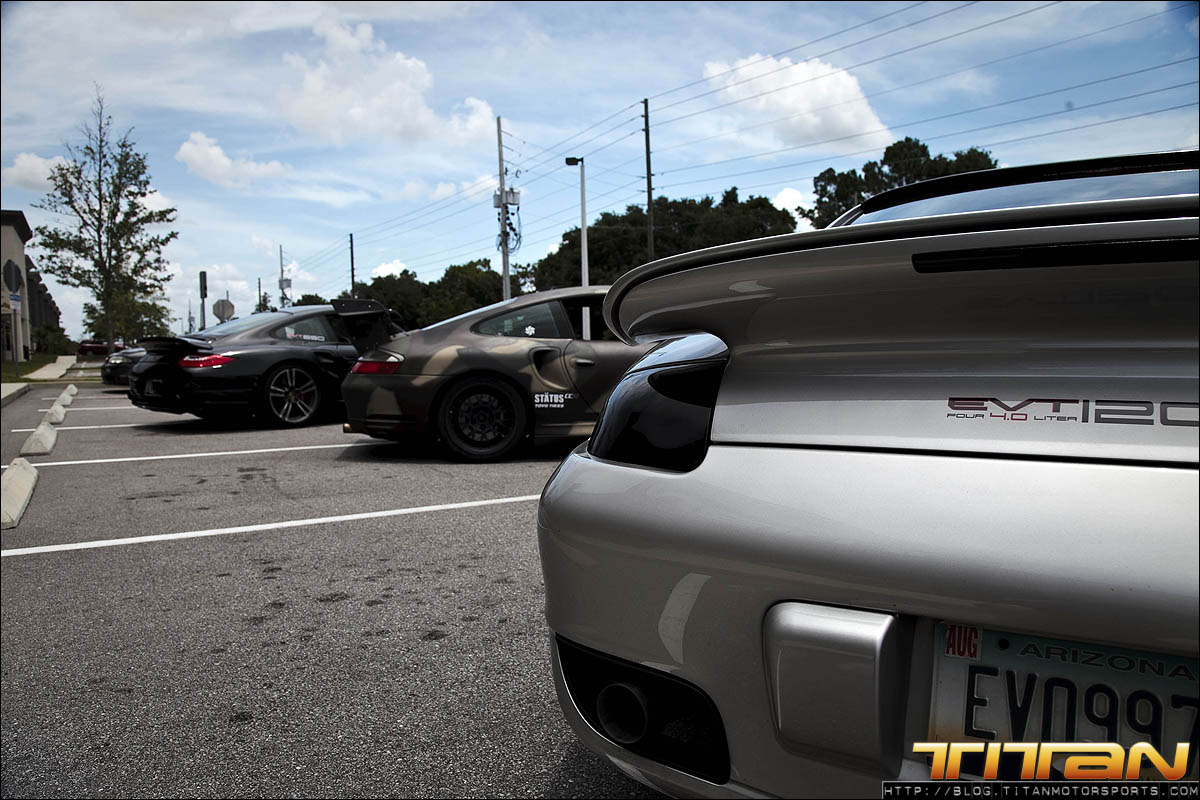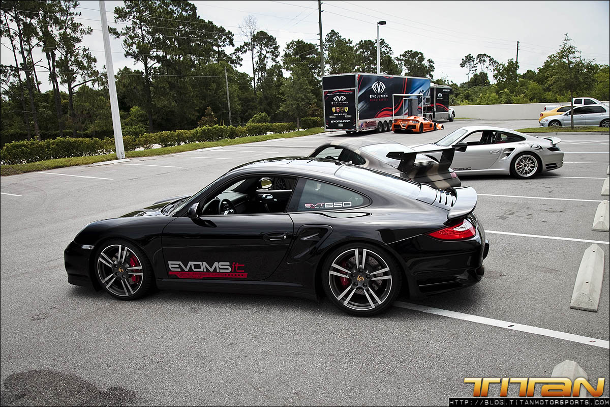 Evolution Motorsports chose Titan Motorsports as the official Orlando stop for their East Coast Summer Tour. After spending a few days in South Florida, the EvoMS crew trucked up the turnpike in their toterhome carrying the EVT650 Porsche 997.2 PDK, EVOT1200 Porsche 997.1, and Gumpert Apollo super car. Todd Zuccone and Matt Carrick kicked off the visit with a seminar for our employees on the history of Evo and their commitment to building only the highest quality Porsche products on the market. We were then treated to a first hand look at some of the great vehicles put together at Evolutions Arizona facility and the precision engineering in their complete tuning packages. I personally enjoyed the EVT650 car, I’ve never been a big fan of automatic sports cars, however the PDK system combined with the additional horsepower provided by Evo upgrade package made for a very fast, responsive car that drove better than stock.