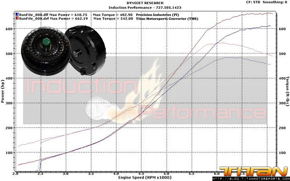 Check out the gains of the Titan Motorsports (TMS) converter vs. the Precision Industries (PI) converter. This test was conducted by Alpha at Induction Performance on a stock bottom end, stock head, with HKS 264 camshafts, HKS exhaust manifold, Turbonetics T72 turbocharger, Blitz front mount intercooler, 3″ downpipe, 3″ exhaust, Precision 1000cc fuel injectors, Bosch 044 in-tank fuel pumps (2), AEM Twin-Fire ignition amplifier, Boost Logic built Toyota automatic transmission on E85 with an AEM EMS tuned by Alpha.