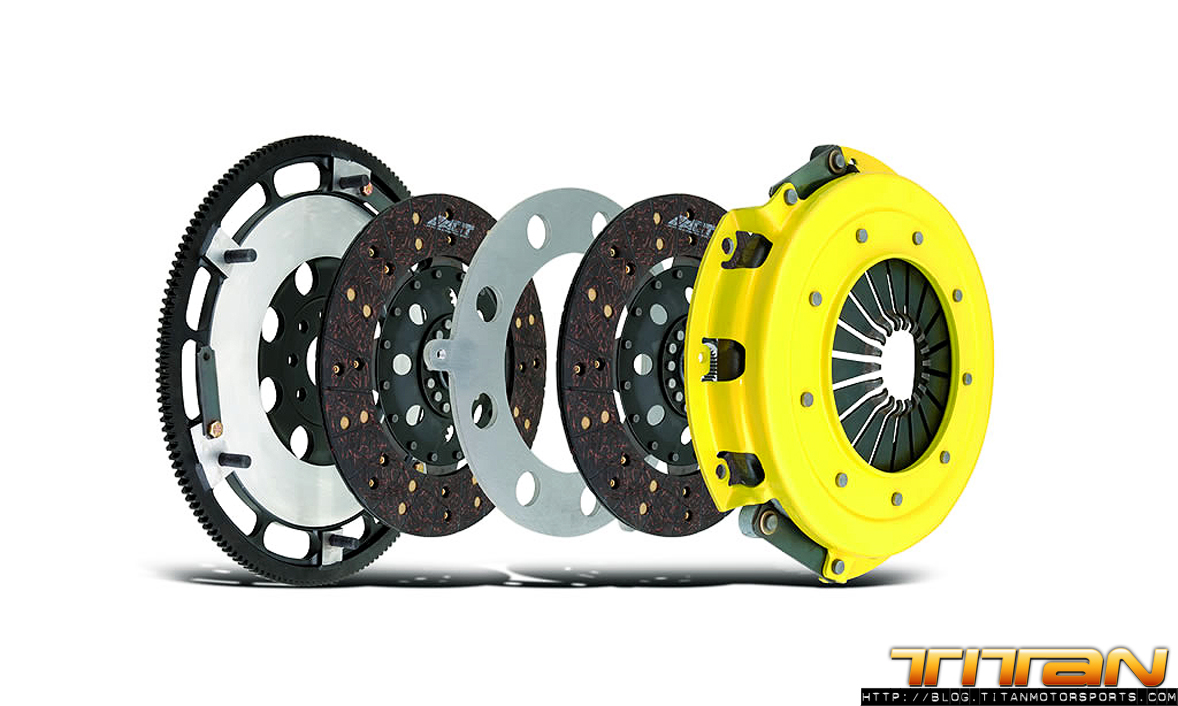 The ACT Race twin-disc kit offers DSM enthusiasts a true race-ready, complete, direct bolt in clutch kit that requires absolutely no modifications. The ACT Race twin disc kit utilizes sintered iron discs for maximum holding capacity (770 lbs/ft of torque) and quick shifting while also offering twice the surface area for high heat capacity and long life. Each kit has an overall weight of 16 lbs as compared to the 29 lb stock kit (a 45% decrease in weight) and results in a very low moment of inertia. With ACT’s ability to design and manufacture their own diaphragm springs, pedal load was kept to a minimal 20% increase over the stock pedal load. The twin-disc is available in 6 bolt (ACT-T1RR-M01) and 7 bolt (ACT-T1RR-M02) configurations.