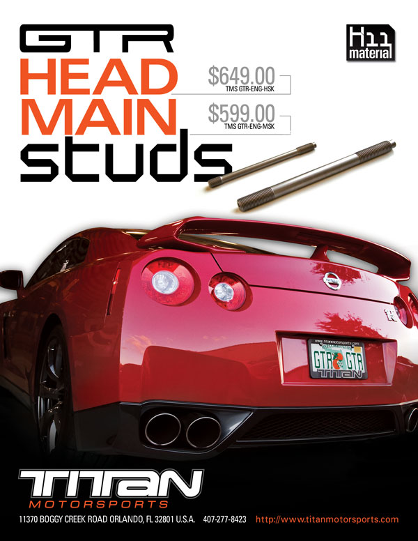Titan Motorsports is proud to announce the all new TMS H11 Head Stud and Main Stud Kit for the GTR R35. The H11 stock dimension head studs have approximately 35% higher clamp load and the main studs have approximately 50% higher clamp load rating than the OEM studs for the GTR. Made from H11 material, a premium steel that is processed to deliver superior strength and fatigue properties. These head and main stud kits are essential for those looking to push their VQ38DETT to the limit, as the stock offerings are unable to handle the rigorous pressures produced by higher performing engines.
