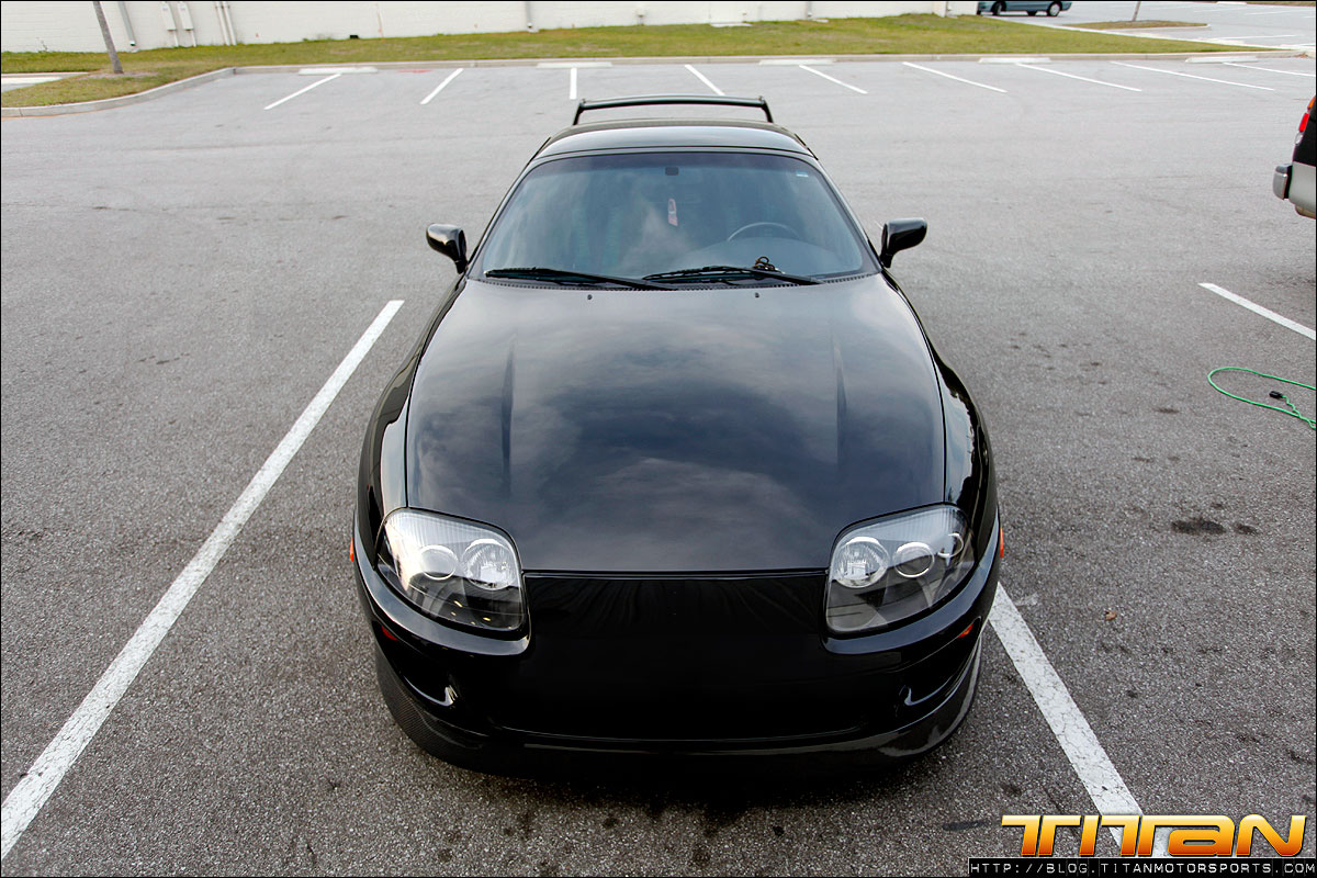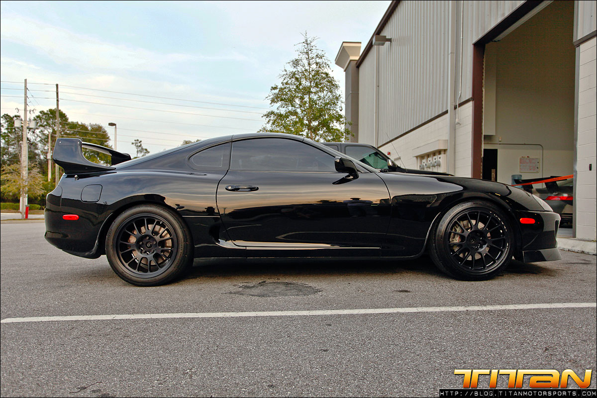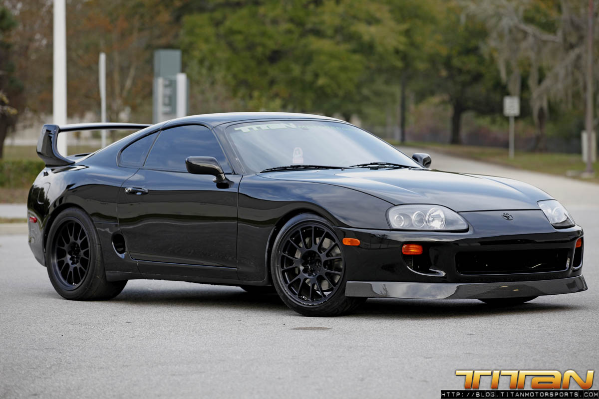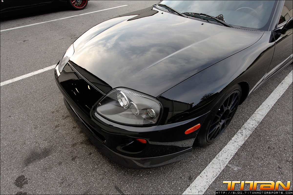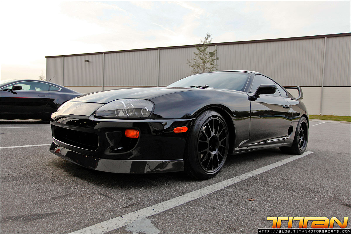 After starting life out as a red 6 speed car, this Supra has since been brought to Titan Motorsports for a bit of a makeover. The car now sports a new sleek black paint job, coupled with Sparco Torino seats (with Takata harnesses), upholstered in custom suede with green stitching. To complement the seats, the door panels, shift boot, arm rest and headliner have all been updated to match. The trunk has also received some attention by way of 2 Kicker 10” speakers, custom amp rack, Hertz mids and highs, and a Sony head unit. To round out the mods, this Supra also rocks a set of CCW C14 wheels, Paisley front lip, and Rod Millen carbon wing. Currently the engine has remained relatively unchanged, with upgrades coming in the near future.