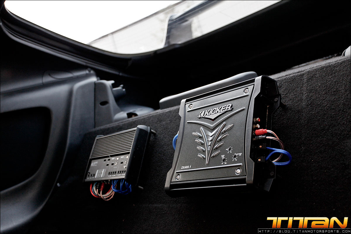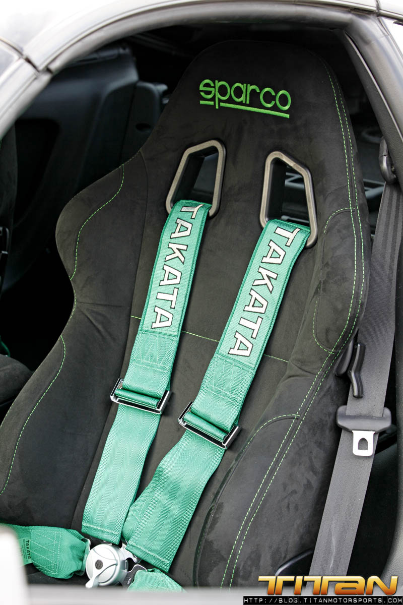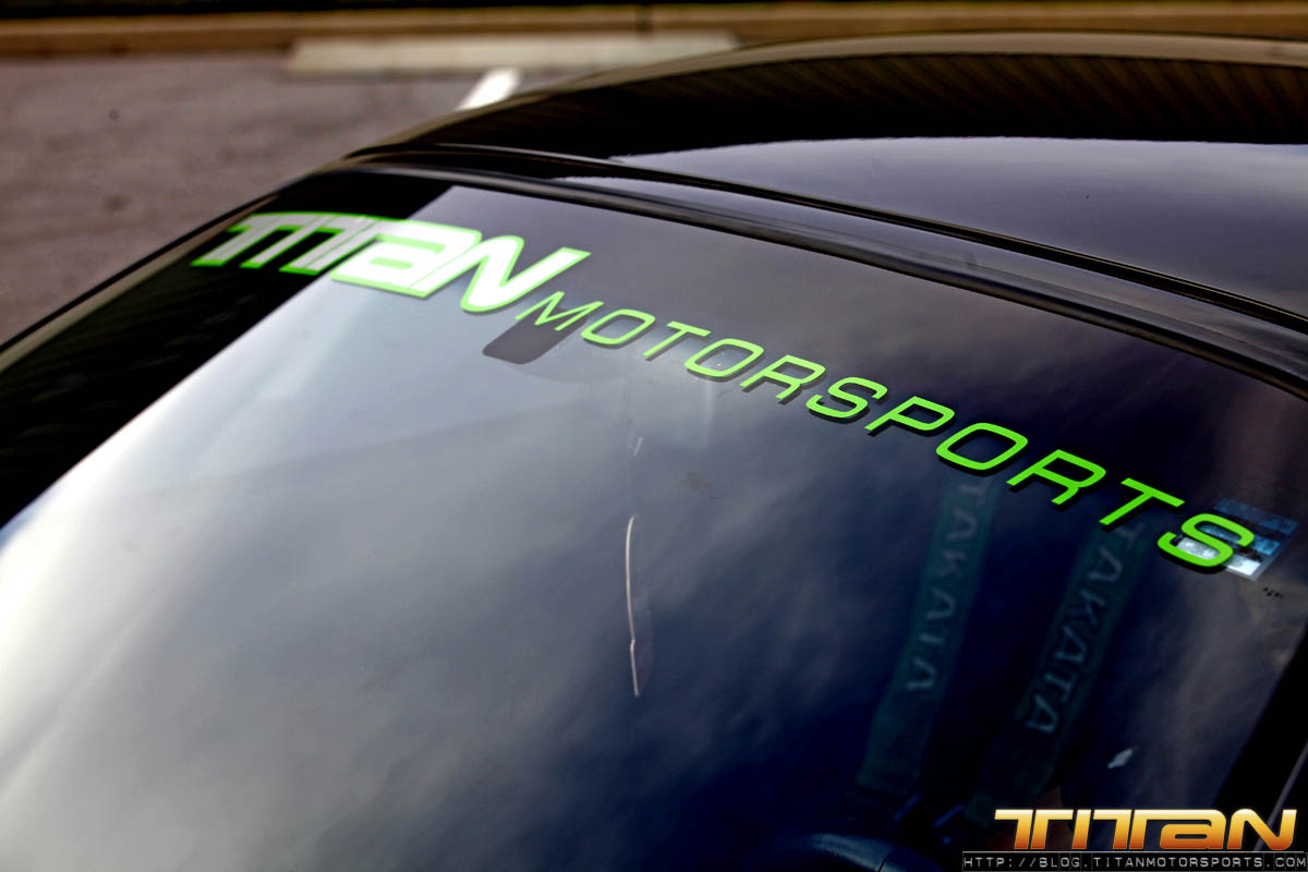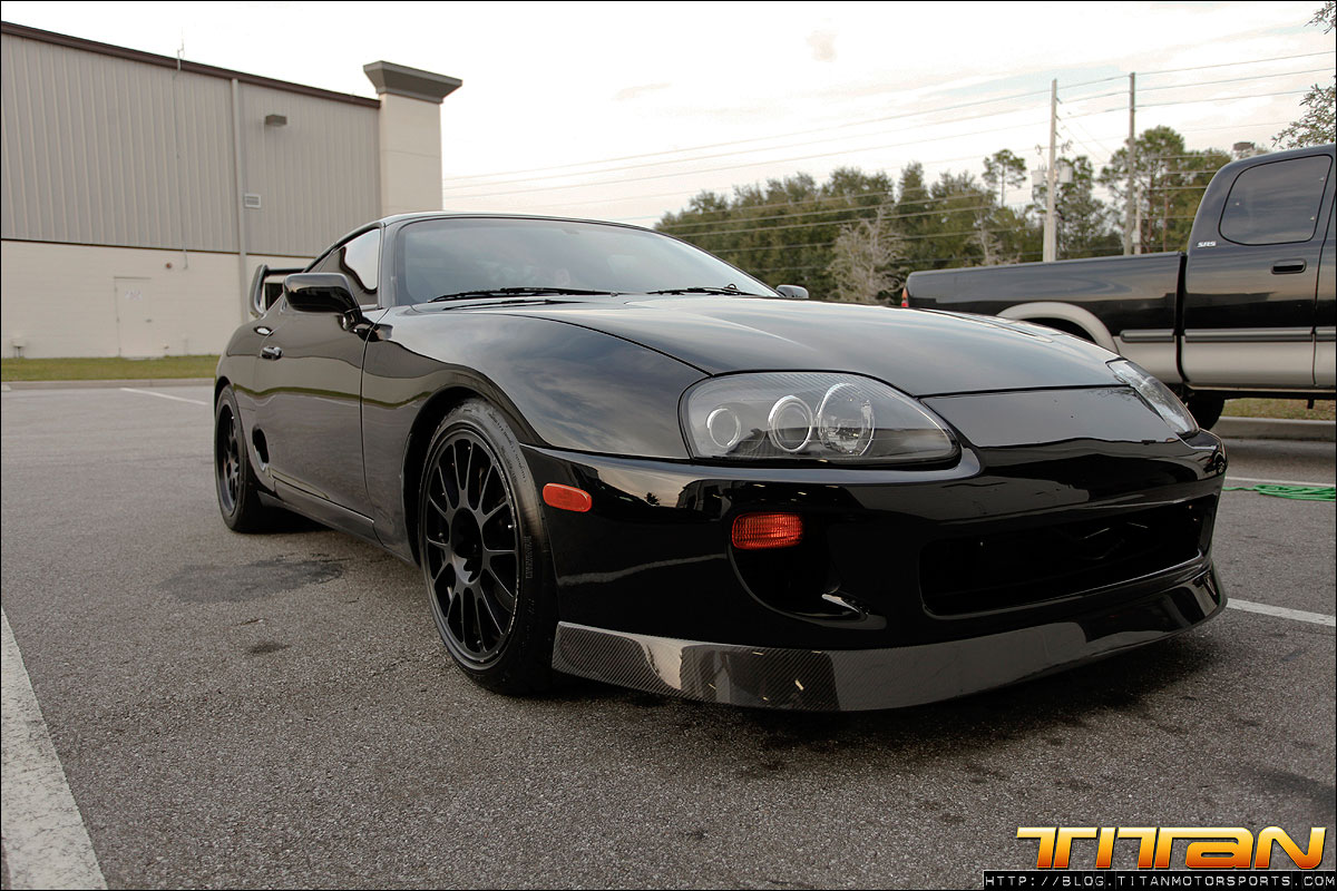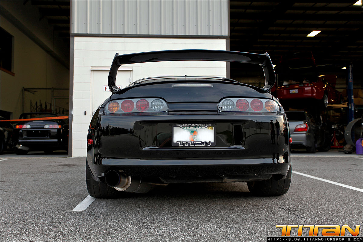 After starting life out as a red 6 speed car, this Supra has since been brought to Titan Motorsports for a bit of a makeover. The car now sports a new sleek black paint job, coupled with Sparco Torino seats (with Takata harnesses), upholstered in custom suede with green stitching. To complement the seats, the door panels, shift boot, arm rest and headliner have all been updated to match. The trunk has also received some attention by way of 2 Kicker 10” speakers, custom amp rack, Hertz mids and highs, and a Sony head unit. To round out the mods, this Supra also rocks a set of CCW C14 wheels, Paisley front lip, and Rod Millen carbon wing. Currently the engine has remained relatively unchanged, with upgrades coming in the near future.
