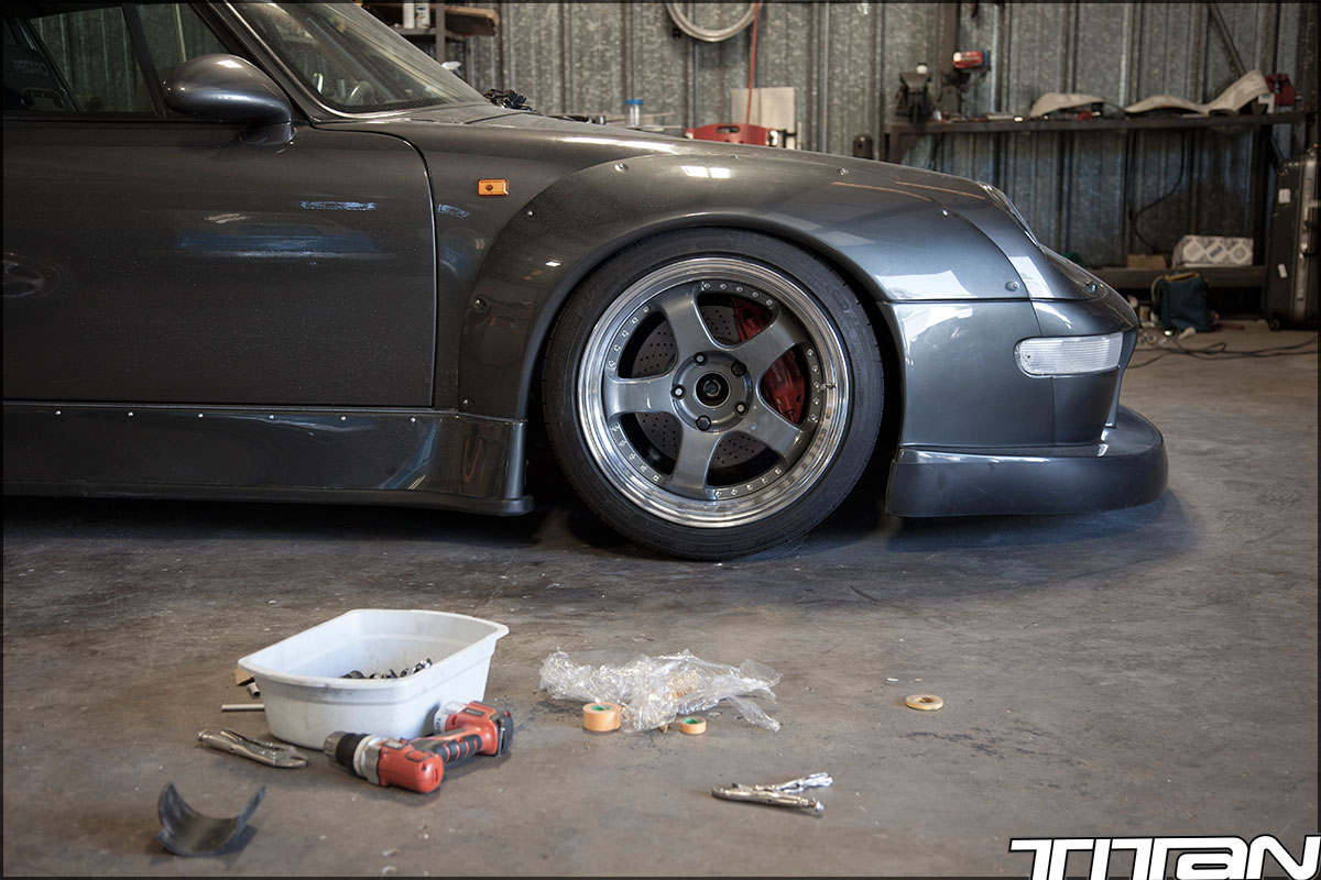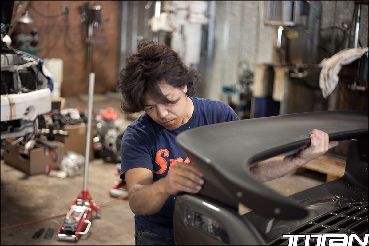 To get things started I’ll talk a bit about the process from what I gathered that afternoon in both talking to Chad and Nakai. Chad originally contacted RWB Japan and bought the kit and appropriate Work wheels directly from them with some help from Marc at RWB USA. The body kits arrive unfinished and must be painted by a local paint shop prior to Nakai arriving. The build is then fit into Nakai’s busy schedule so that he can be on site to fit and install the entire kit and set the ride height of the vehicle appropriately. All off the cutting, fitting, drilling and installation happen on an already prepped and painted car, a true testament to the craftsmanship required (which can also be difficult to watch as Chad had to look away many times).