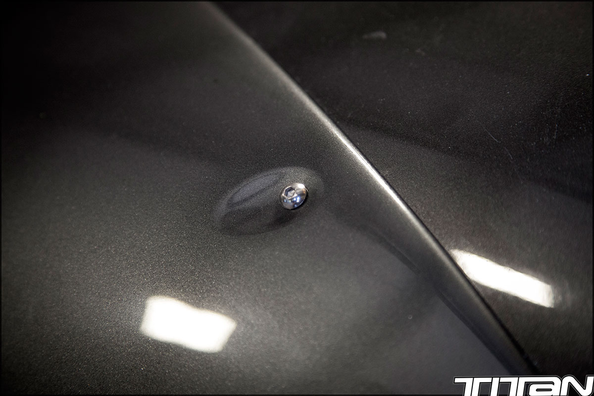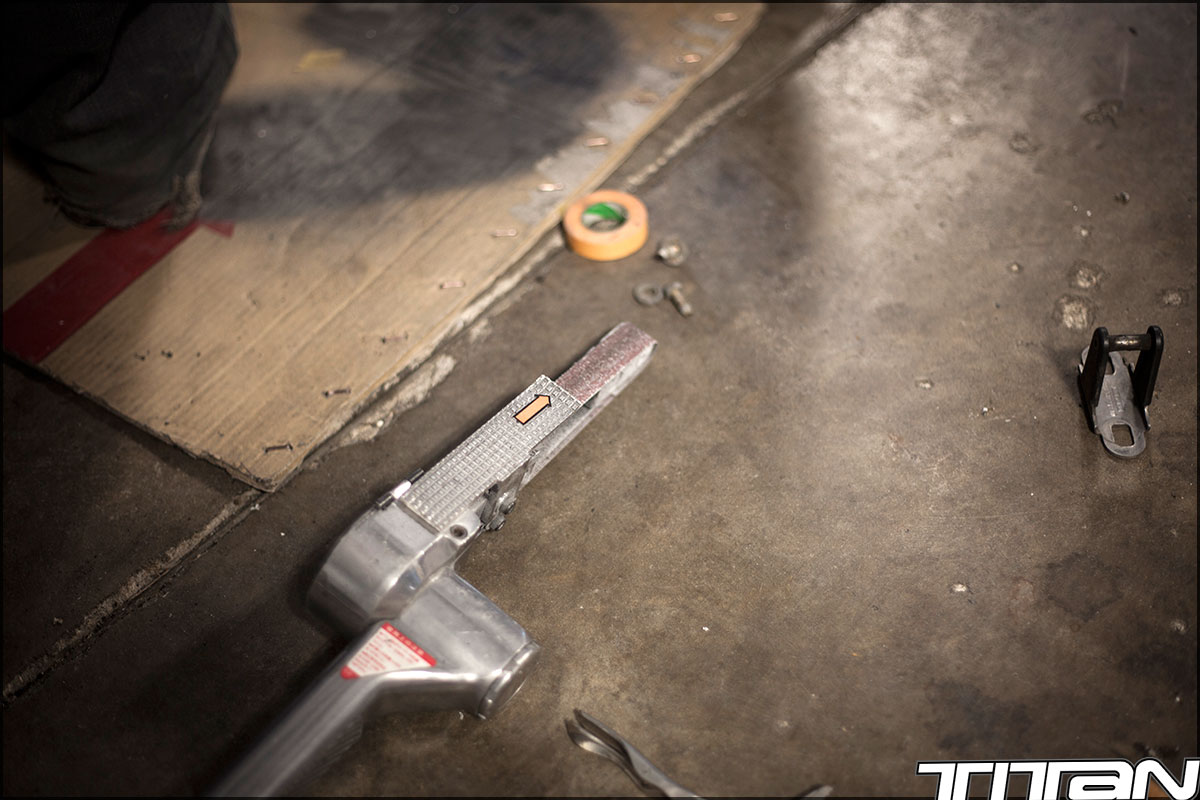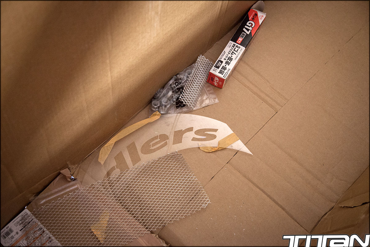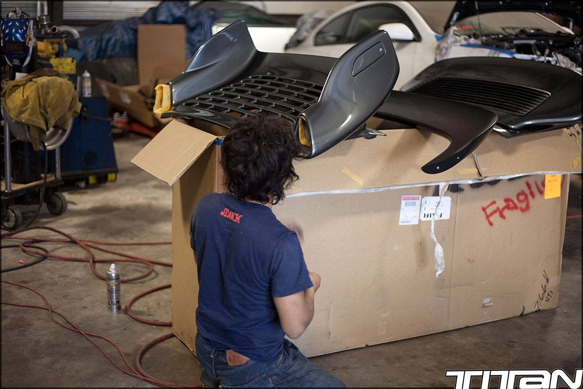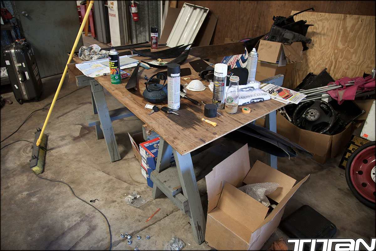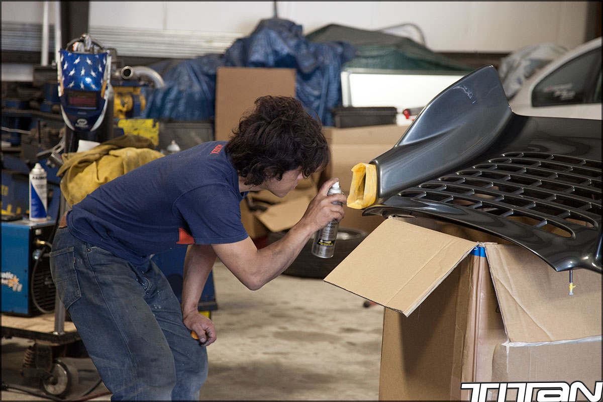 The buildout is very raw, here you can see Nakai painting the mesh inserts black using a spray can and tape. These parts had just arrived from the body shop after a fresh color sand and buff, and still remain overspray free after being spray bombed thanks to clever tape and newspaper work. It’s moments like these that can be difficult for the owner to see but are just part of the process of transforming the car.