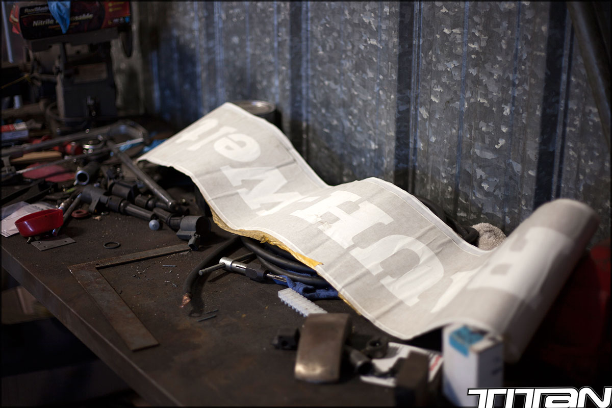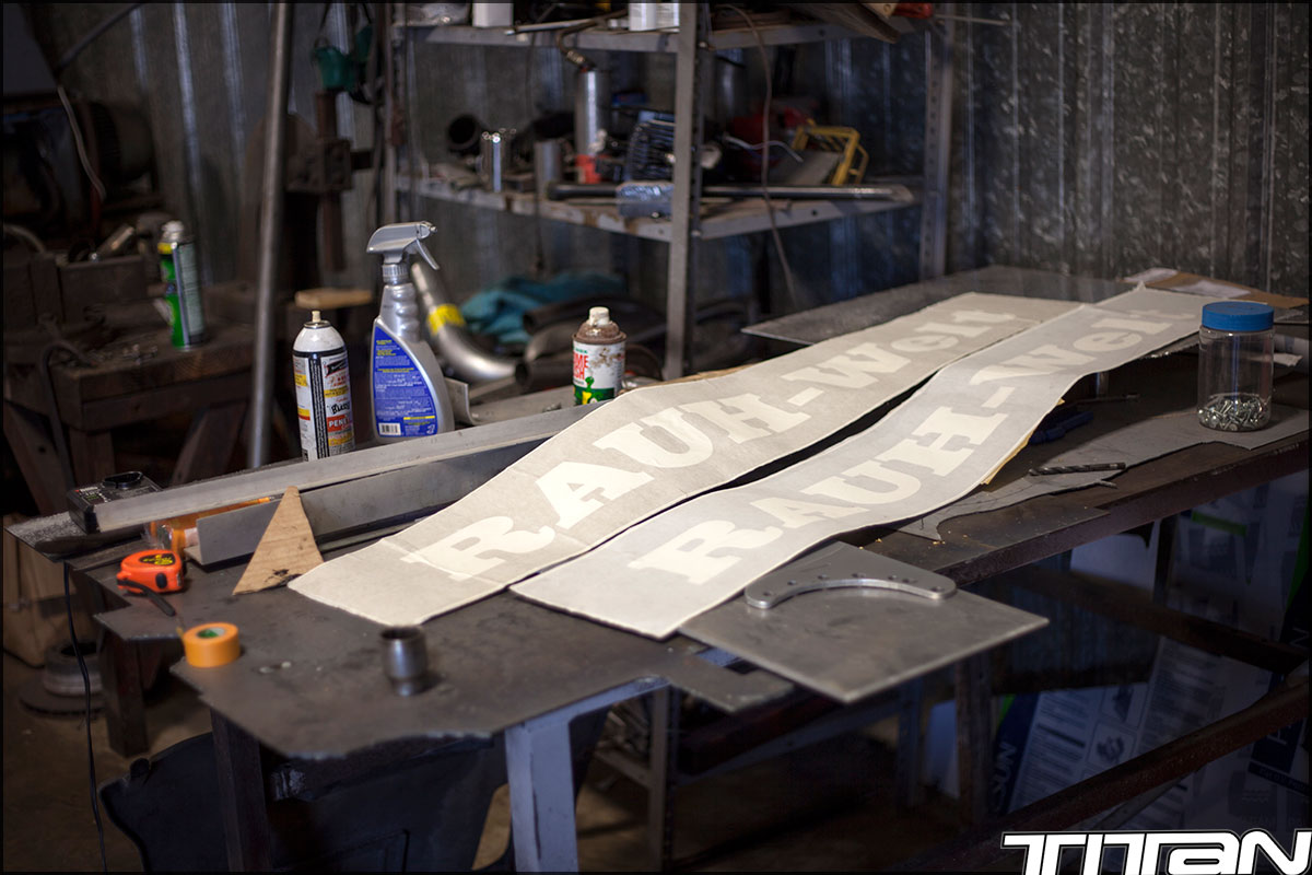 The coveted Rauh Welt windshield banner and Idlers stencil to be installed at the completion of the build. This stencil will be left with the car for touch ups and application on fresh tires for the future.