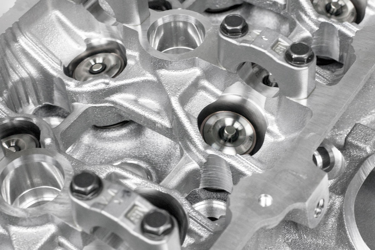 The valvetrain was produced in partnership with industry leader Ferrea to ensure the valve and spring package would operate harmoniously with the increased airflow provided from the CNC porting. This upgraded cylinder head utilizes an upgraded OEM valve size and dual spring combination in conjunction with titanium retainers to maintain the lightest valve train possible without sacrificing durability. Reducing the valvetrain weight allows the engines redline to be raised and consistent and reliable engine revolutions in the 9000+ range to be achieved.