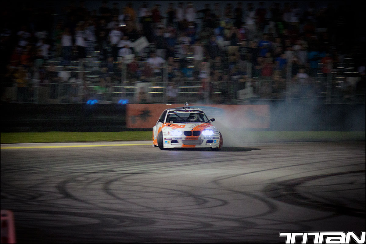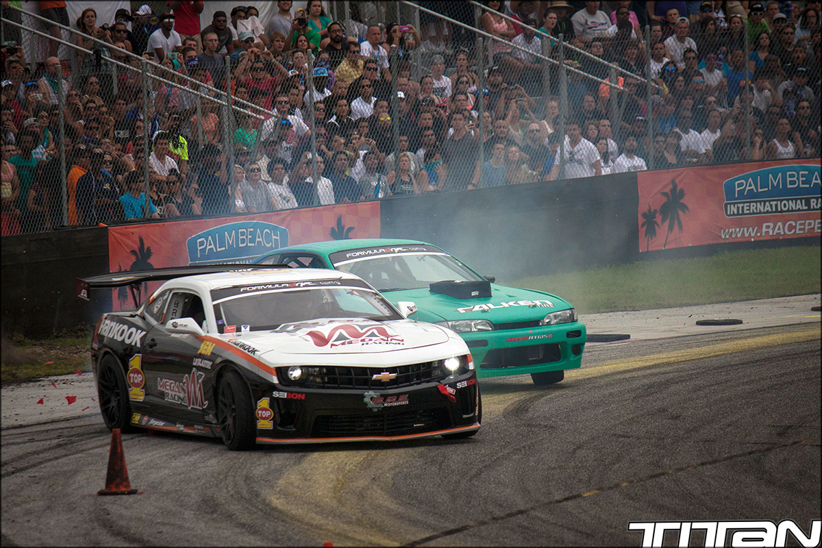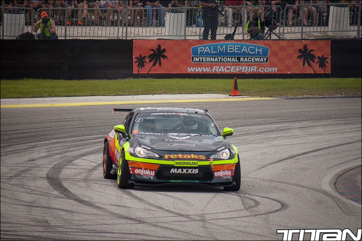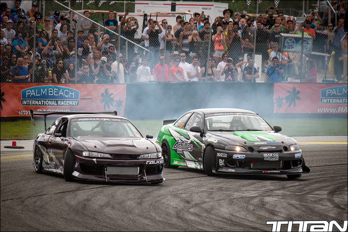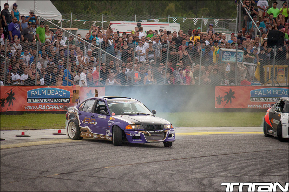 Formula Drift invaded Palm Beach International Raceway this weekend as thousands of fans filled every inch of space surrounding the drift circuit. We’ve been closely following drifting for years and enjoy checking out the competition all while visiting with some of our old drag racing competitors. There was plenty of action and controversy throughout the event with the fans questioning many of the judges calls and quite a bit of contact within the runs. In the end Michael Essa took the top spot in his E46 BMW (you may remember his Z4 car from his visit to the shop prior to last years event) flanked by the Achilles Tires entrants of Daigo Saito and Robbie Nishida. The podium was swept by turbocharged 6cylinder entrants,could we possibly be seeing a changing of the guard in FD with turbocharge entrants becoming the norm over the previous V8s? Who knows, but we like what we saw and always have our door open to the possibility of building a wild Formula Drift competitor here at Titan Motorsports, sponsors and manufactures our number is listed on the site. A big thanks to Cheralyn and the Bridges Racing (Achilles Tires) Team for the great hospitality all weekend.