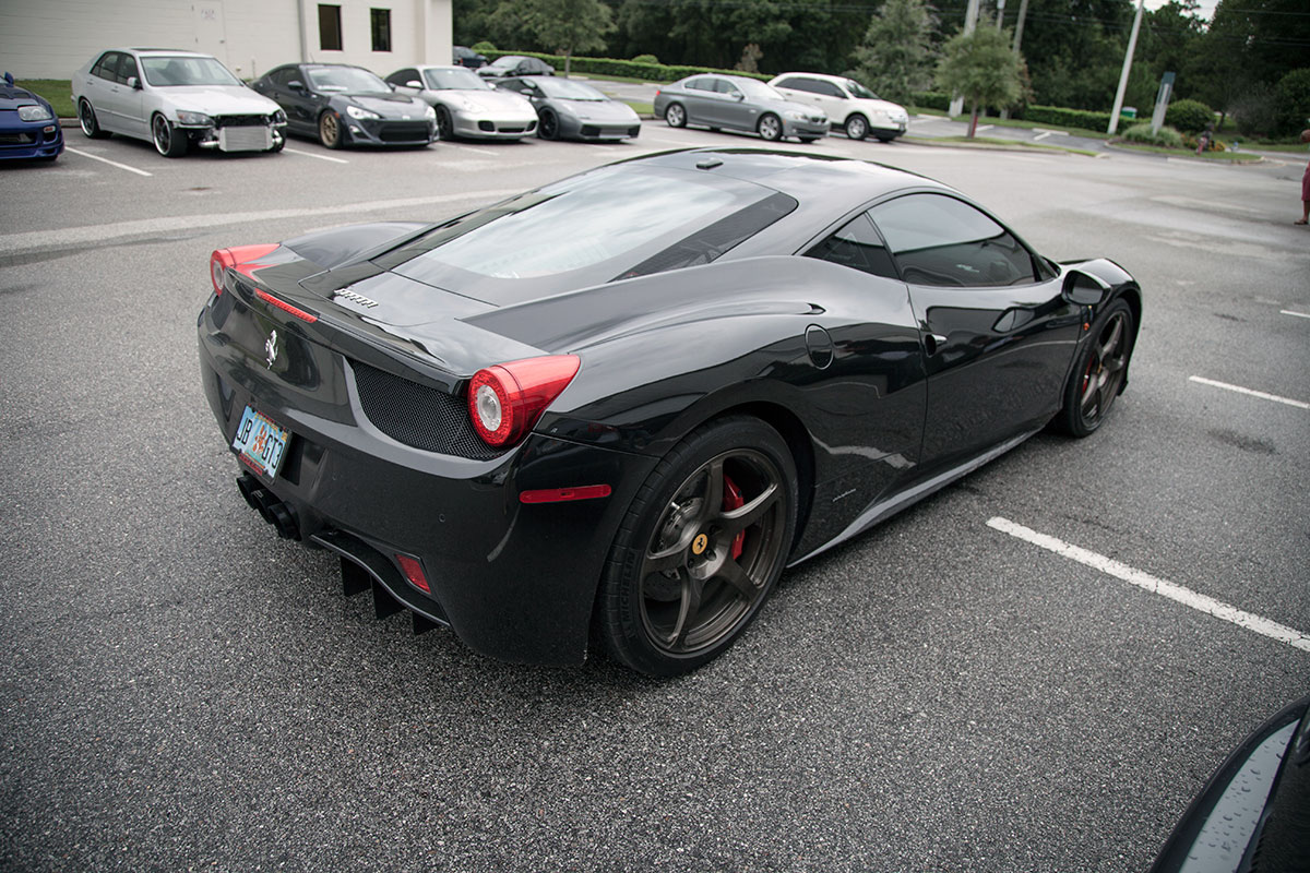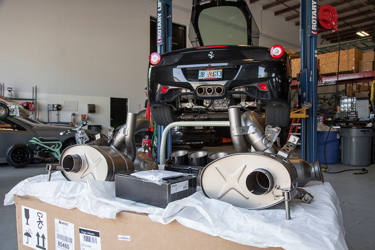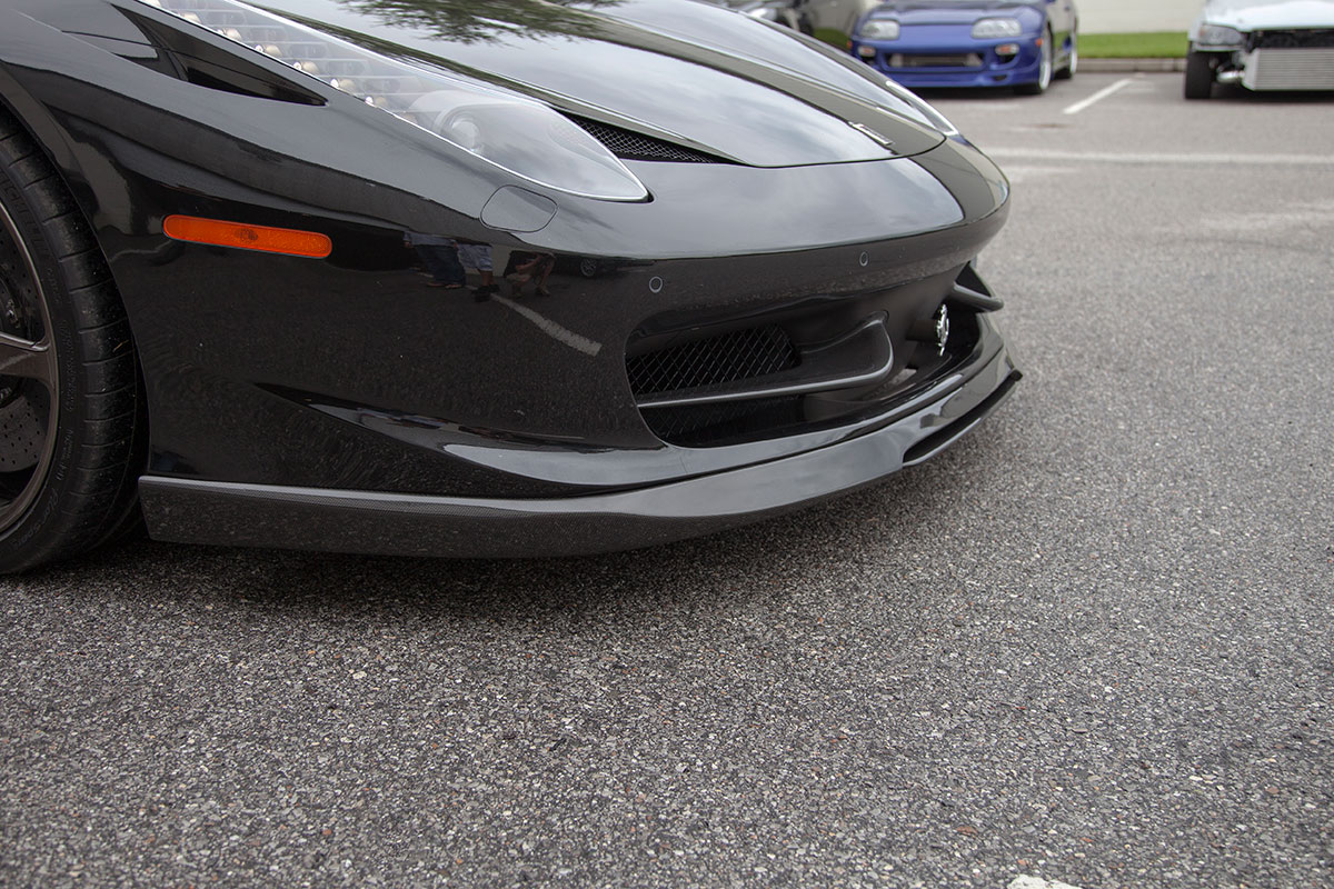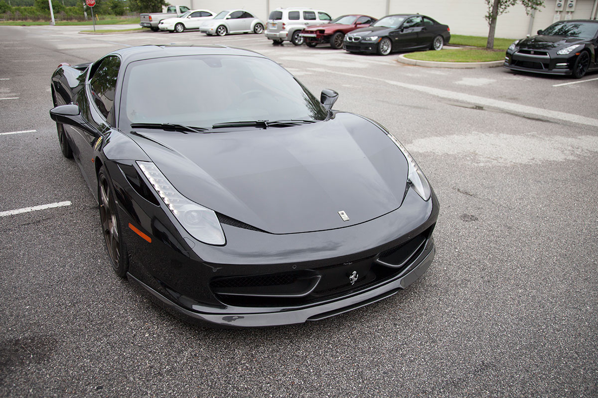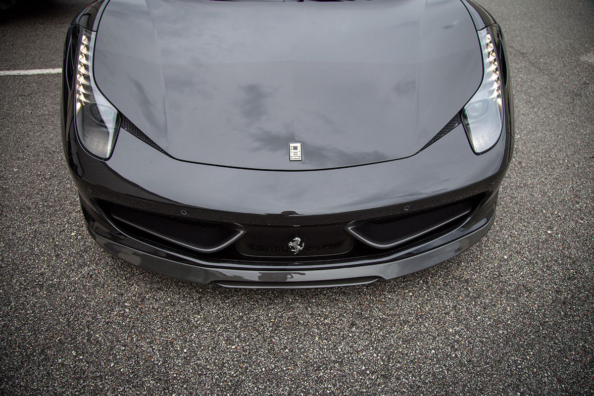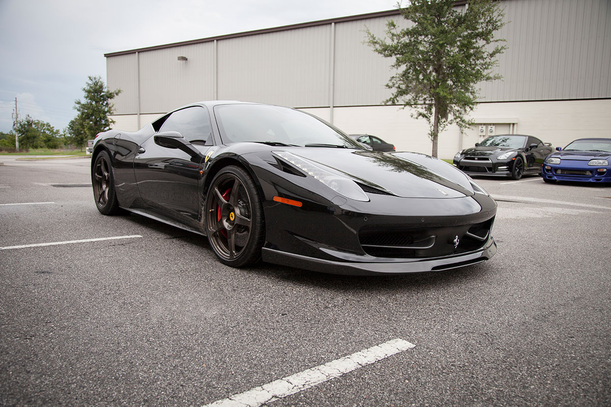 Our good friend Jim pulled up to the shop a few weeks back in his new Ferrari 458, he’s not your typical Ferrari owner however who lets the car sit and collect dust in an air conditioned garage. Jim makes sure all of his cars get used properly and takes great pride in modifying them to put his own personal touch on them. The car arrived already sporting plenty of carbon Oakley Design parts, but was lacking a front lip. We installed the Vorsteiner carbon fiber lower lip which features a center vent that really sets off the 458 from the front. The part fit great right out of the box and required little modification to bolt on. An Akrapovic full Titanium exhaust with carbon fiber tips was chosen to give the already menacing looking car an entoxicating tone and help the engine breath easy. Evolution Motorsports provided us with an ECU re flash to help make sure the car made use of all the extra exhaust flow provided by the Akrapovic exhaust. The car was also lowered on HRE P45S wheels treated to a one of a kind brush tinted bronze finish. It’s truly a unique looking finish in person and goes quite well with the jet black exterior. I’m sure we’ll be seeing this car again, if the extra dirt in the photos shows anything, it’s that Jim will be sure to enjoy this unique 458 and we’ll be seeing plenty of it around town!