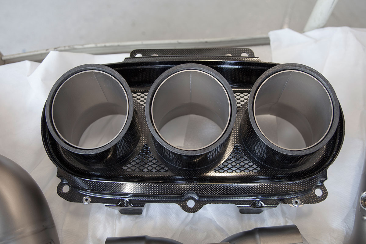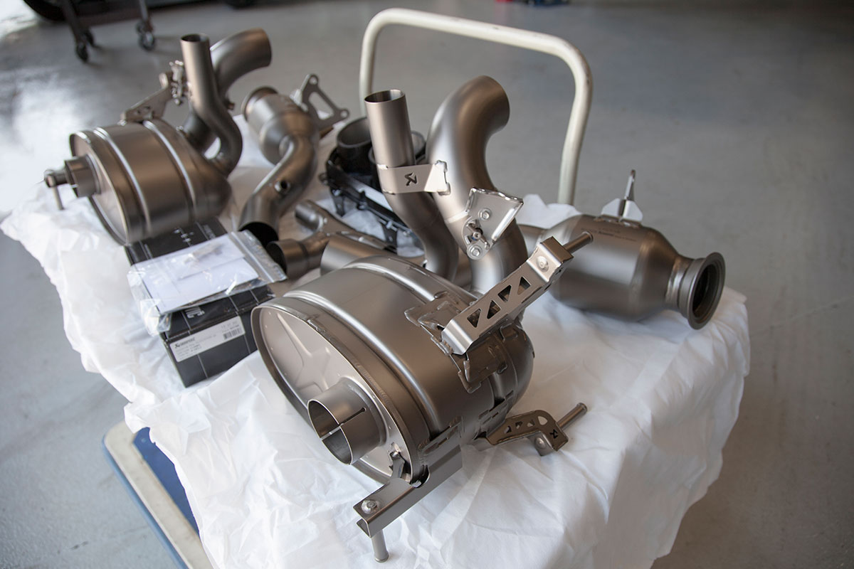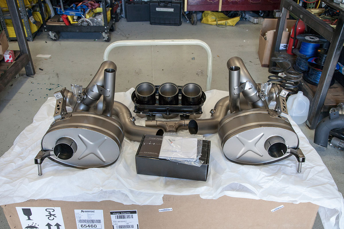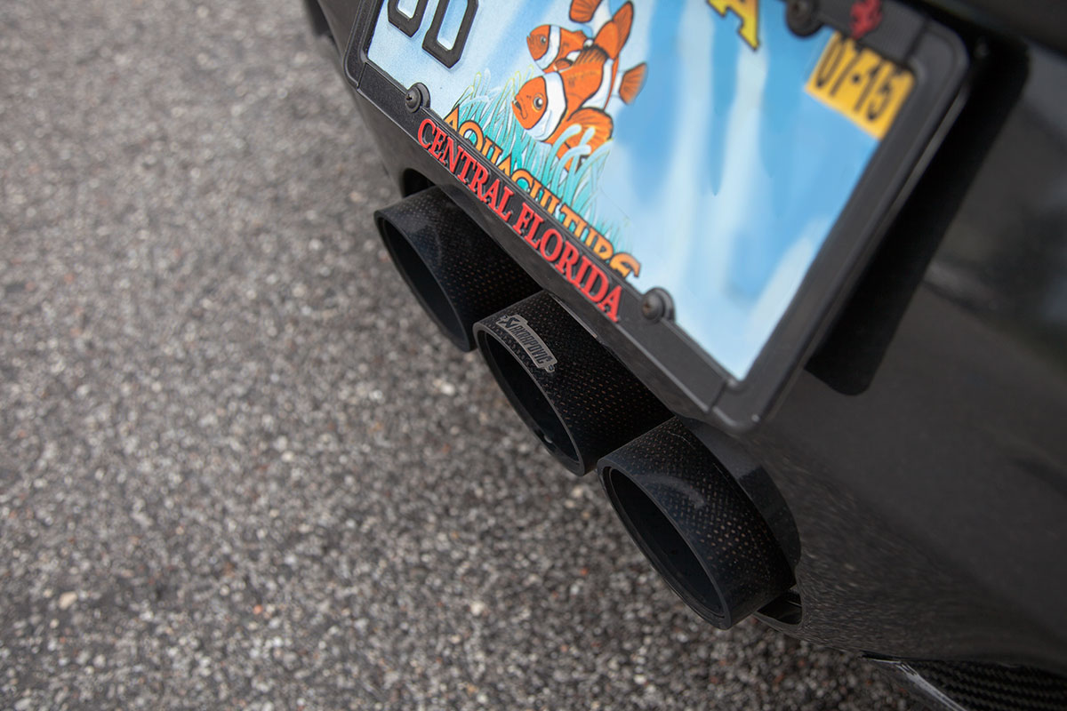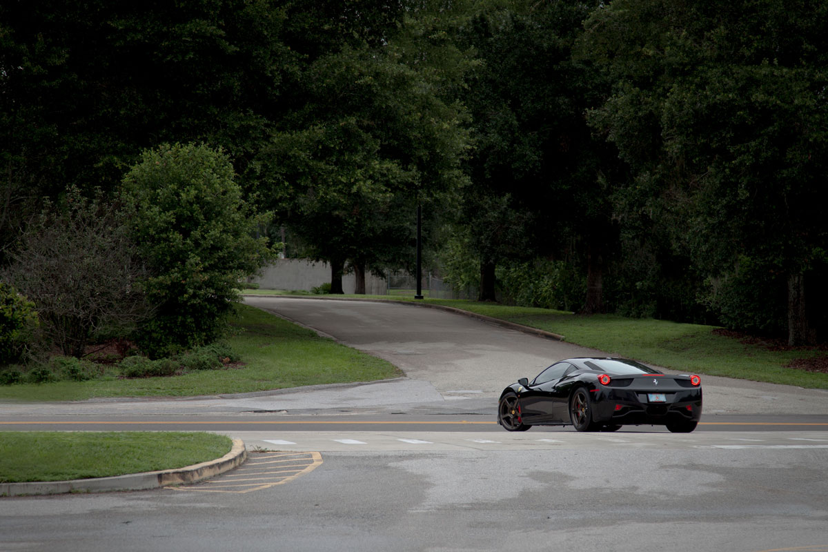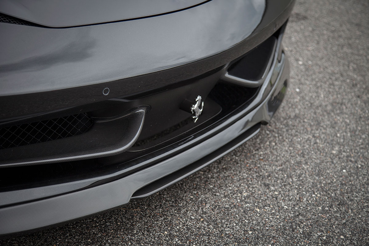 Our good friend Jim pulled up to the shop a few weeks back in his new Ferrari 458, he’s not your typical Ferrari owner however who lets the car sit and collect dust in an air conditioned garage. Jim makes sure all of his cars get used properly and takes great pride in modifying them to put his own personal touch on them. The car arrived already sporting plenty of carbon Oakley Design parts, but was lacking a front lip. We installed the Vorsteiner carbon fiber lower lip which features a center vent that really sets off the 458 from the front. The part fit great right out of the box and required little modification to bolt on. An Akrapovic full Titanium exhaust with carbon fiber tips was chosen to give the already menacing looking car an entoxicating tone and help the engine breath easy. Evolution Motorsports provided us with an ECU re flash to help make sure the car made use of all the extra exhaust flow provided by the Akrapovic exhaust. The car was also lowered on HRE P45S wheels treated to a one of a kind brush tinted bronze finish. It’s truly a unique looking finish in person and goes quite well with the jet black exterior. I’m sure we’ll be seeing this car again, if the extra dirt in the photos shows anything, it’s that Jim will be sure to enjoy this unique 458 and we’ll be seeing plenty of it around town!