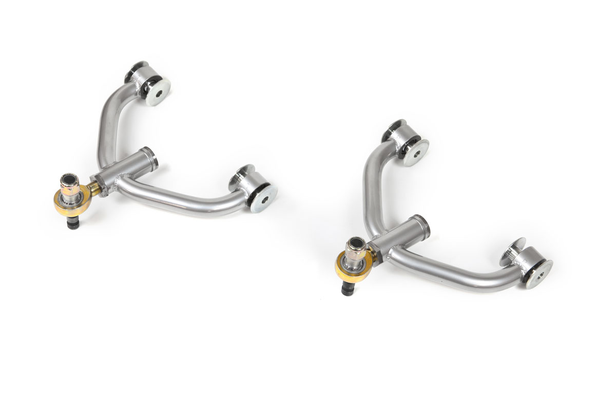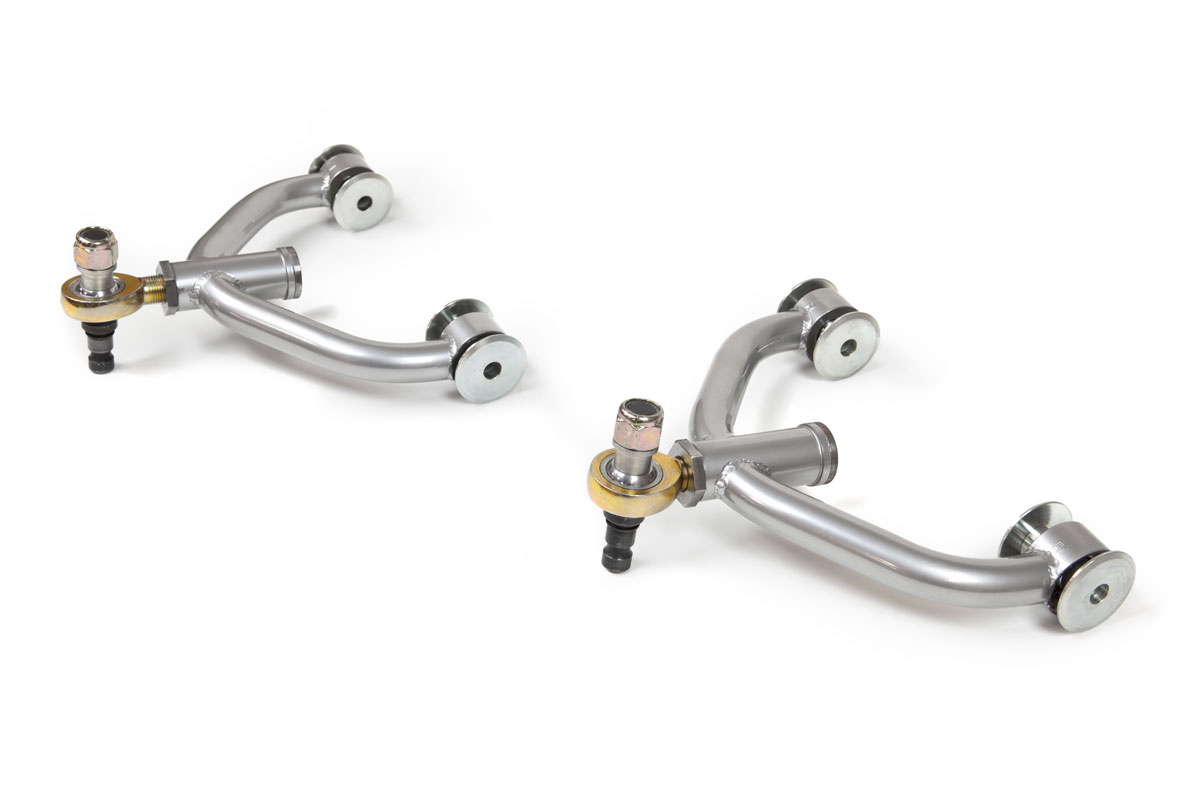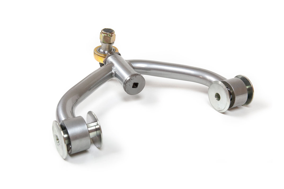 A single barrel camber adjuster allows for quick alignment changes by loosening the jam nut, inserting a standard 1/4 ratchet into the end of the barrel adjuster and turning to lengthen and shorten the upper rod end. The adjuster allows for changes from a factory setup to significant negative camber for those wanting to run wider tires and increase grip at the track. In addition to the benefits of camber adjustments, these control arms also replace all rubber bushings with durable race proven FK spherical bearings reducing play and increasing feedback for the driver when using tires with increased grip.
