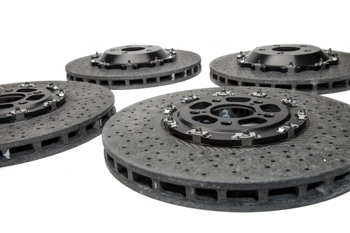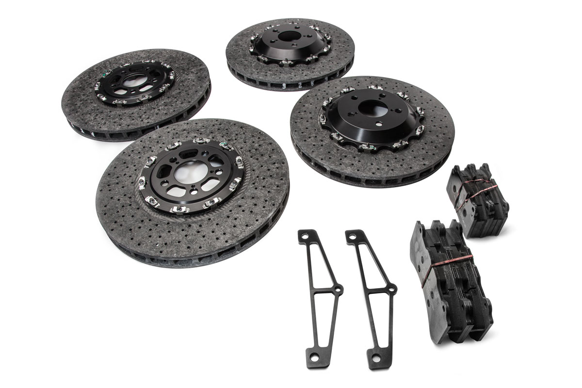Front and Rear Brembo Carbon Ceramic disk with custom GTR fitment Hard Anodized Billet Hats, Front and Rear Carbon Ceramic Specific Performance Brake Pads, and Billet Hard Anodized Caliper Spacer Brackets